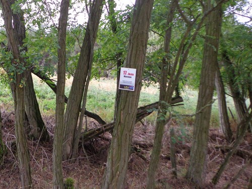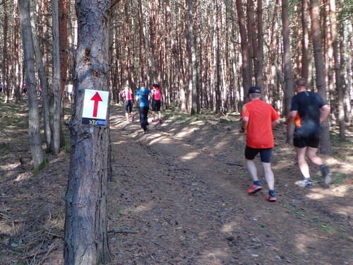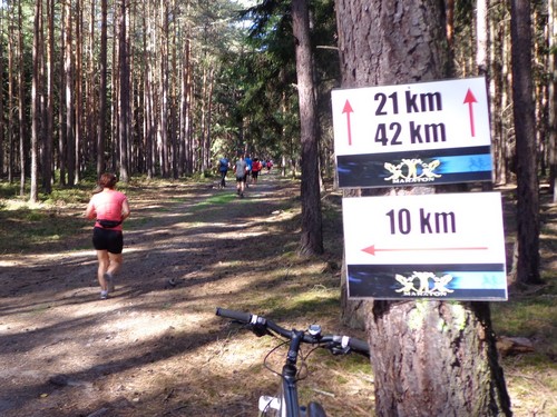 Auf einem Sandweg geht es im Schatten an einem Bach entlang und nach 2km über ein Holzbrückchen, links unter einer Eisenbahnunterführung durch und dann gleich rechts in einen Kiefernwald den Berg rauf. Auf halber Höhe biegen die 10km-Läufer ab. Nach 28min das erste km-Schild das ich sehe. Es löst Verwunderung aus. In roter Schrift 4km, in grüner Schrift 3km – dabei sind wir gleich weit gelaufen! Hätten die Halbmarathonis die Startehrenrunde gar nicht laufen sollen? Laufen die heute einen km extra? Ja, sieht ganz so aus.