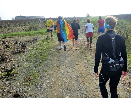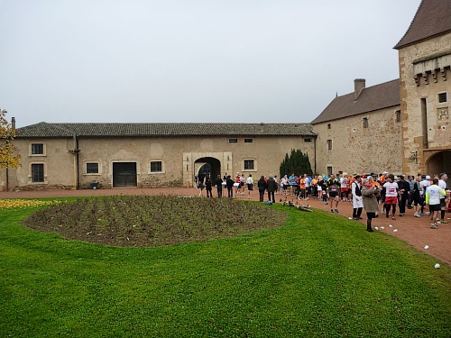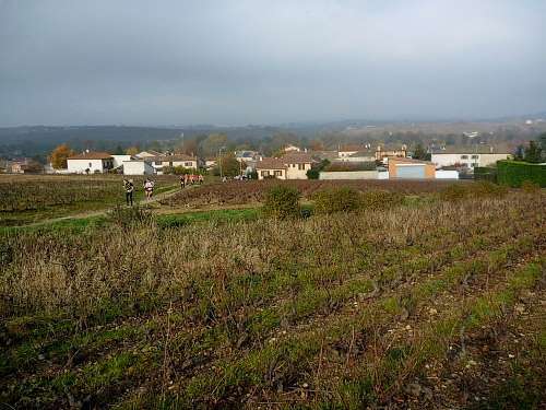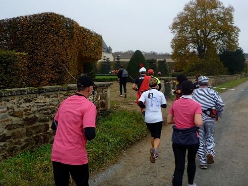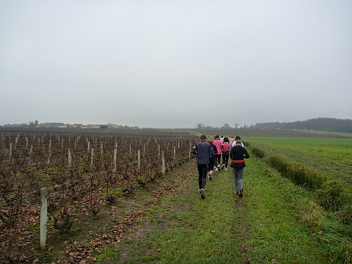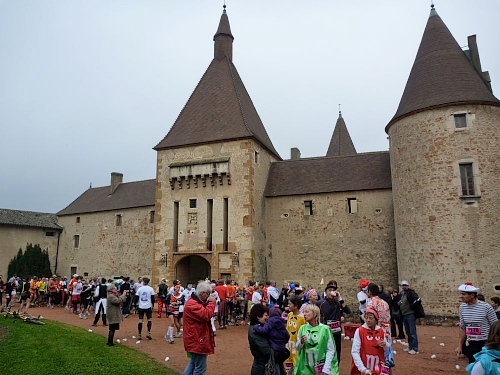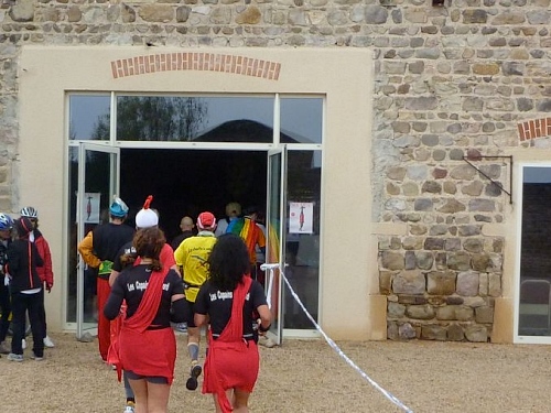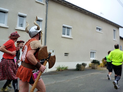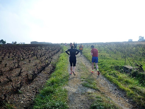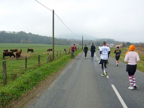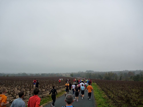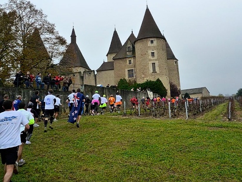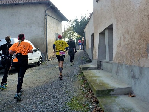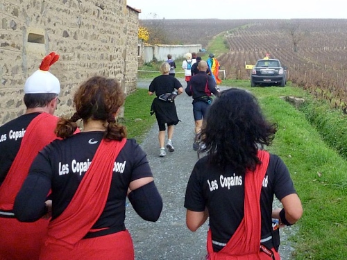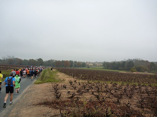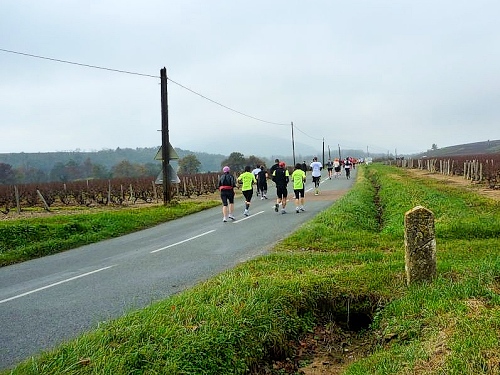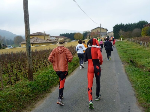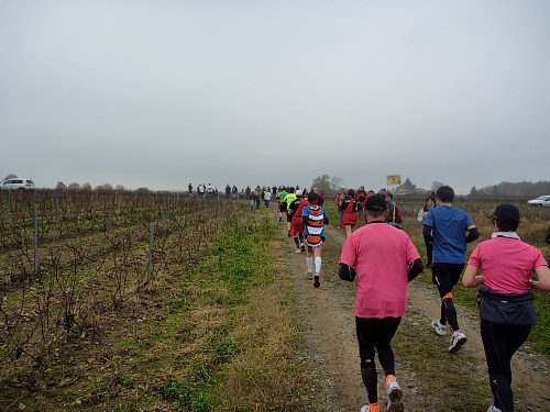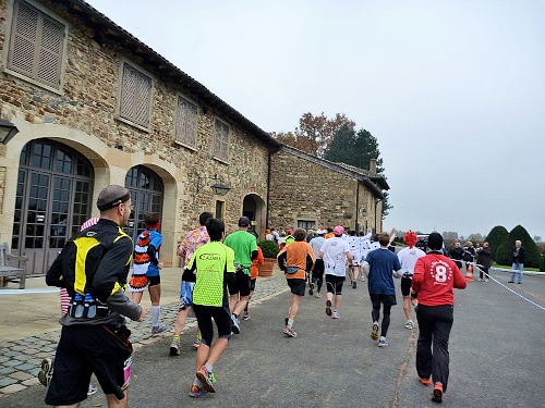 Der Lauf ist Teil einer ganzen Reihe von Veranstaltungen in diesen Tagen. Allen gemeinsam ist das Feiern des neuen Weins. Deshalb auch der Slogan „Le Beaujolais nouveau est arrivé“. Die Kehrseite der Geschichte, die Felder sind gnadenlos leergeputzt. Die eine oder andere Traube ist noch zu sehen, aber sonst ist alles kahl. Der Anblick passt (leider) zum Wetter. Aber es ist auch Abwechslung geboten. Viele sind kostümiert am Start. Von dezent und gut geeignet zum Laufen bis zu „wow, wie kann man so überhaupt laufen“ ist alles dabei. Comic-Gallier, Wikinger, Vampire, die Blues Brothers, und so weiter. Kurz vor mir biegt eine 8-köpfige Seilschaft in einen Feldweg ab, um sich geschlossen zu erleichtern. Die einzige Dame in der Gruppe wirkt sehr gefasst. Dank der fixen Seilverbindung bleibt ihr auch kaum etwas anderes übrig.