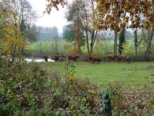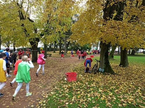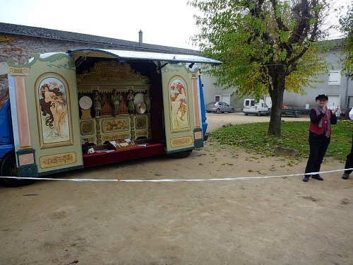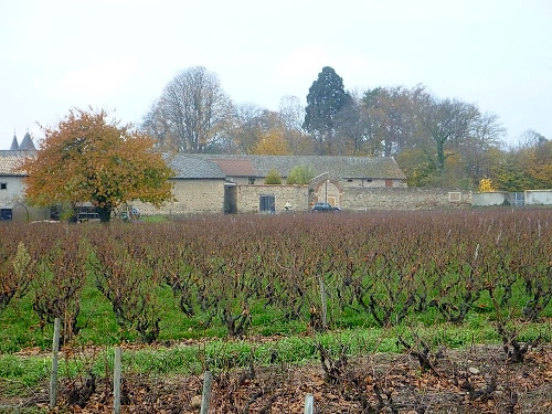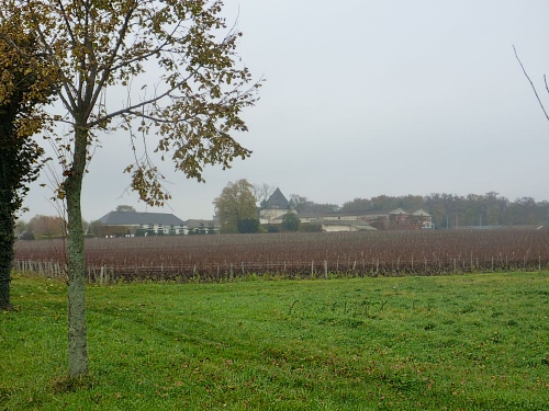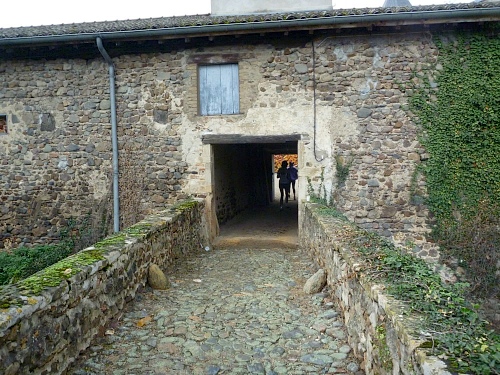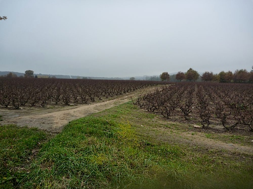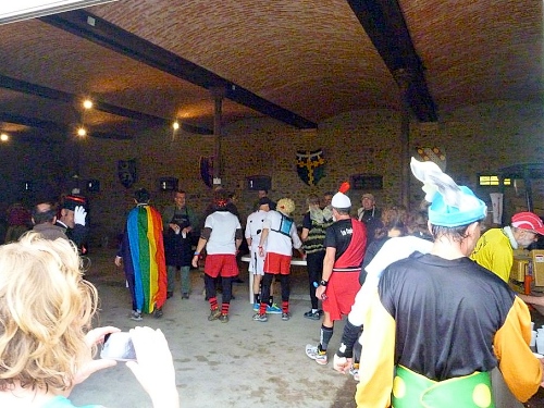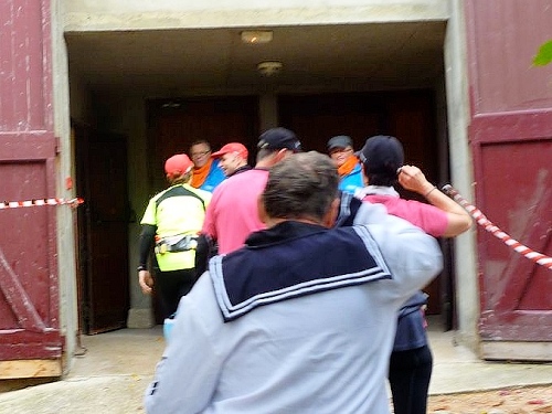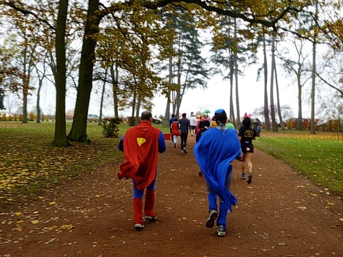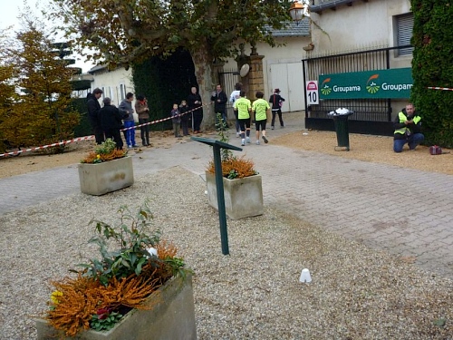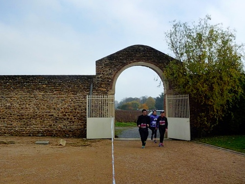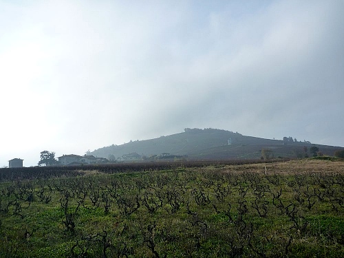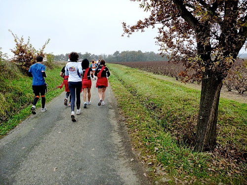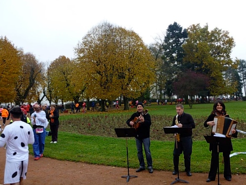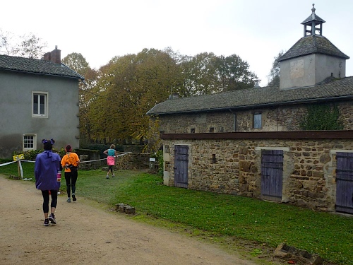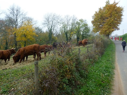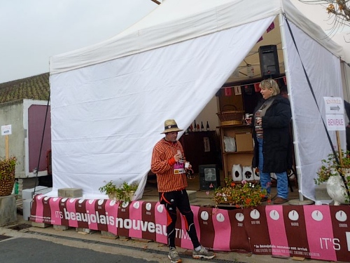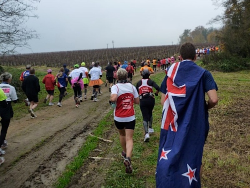 Der Lauf ist Teil einer ganzen Reihe von Veranstaltungen in diesen Tagen. Allen gemeinsam ist das Feiern des neuen Weins. Deshalb auch der Slogan „Le Beaujolais nouveau est arrivé“. Die Kehrseite der Geschichte, die Felder sind gnadenlos leergeputzt. Die eine oder andere Traube ist noch zu sehen, aber sonst ist alles kahl. Der Anblick passt (leider) zum Wetter. Aber es ist auch Abwechslung geboten. Viele sind kostümiert am Start. Von dezent und gut geeignet zum Laufen bis zu „wow, wie kann man so überhaupt laufen“ ist alles dabei. Comic-Gallier, Wikinger, Vampire, die Blues Brothers, und so weiter. Kurz vor mir biegt eine 8-köpfige Seilschaft in einen Feldweg ab, um sich geschlossen zu erleichtern. Die einzige Dame in der Gruppe wirkt sehr gefasst. Dank der fixen Seilverbindung bleibt ihr auch kaum etwas anderes übrig.