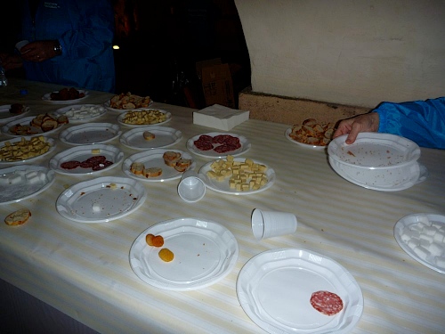 Kilometer 5. Wir erreichen das erste Weingut. Durch ein Tor geht es hinein in den Vorhof des Guts. Für Musik, Speis und Trank ist ausreichend gesorgt. Das Feld ist noch ziemlich dicht, es herrscht ein ziemliches Gewusel an den Ausgabetischen, deshalb verweilen wir nicht allzu lange.