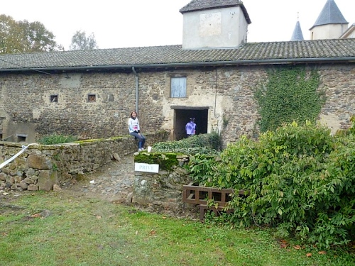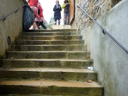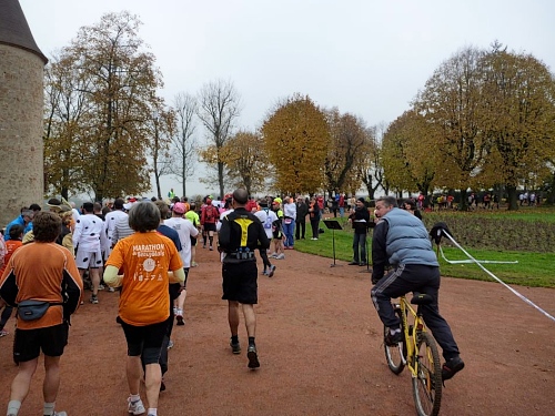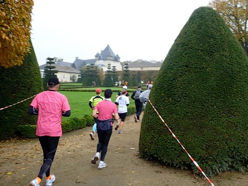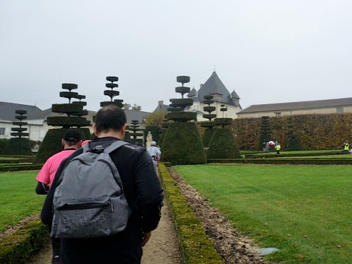 Kilometer 10. Das absolute Highlight des Marathons ist das „Château de Pizay“. Kreuz und quer geht es durch einen wunderschön gestalteten Vorhof. Die Heckenschneider müssen Meister ihres Fachs sein. Vor einem Tor nimmt das Tempo rapide ab. Drin steht ein Ordner, weist nach links und ruft „Attention! Escaliers!“ Über etwa 20 Treppen gelangen wir hinab in einen langgezogenen Weinkeller. Der rote Teppich wurde dort extra für uns ausgerollt. Die riesigen Weinfässer auf der rechten Seite interessieren kaum einen. Viel spannender ist die lange Tischreihe, wo auf einer unzählbaren Zahl an Papptellern mundgerechte Stückchen von Kuchen, Käse, Salami, Baguette, Zuckerwürfeln und Obst liegen. Als Getränk gibt es Wasser und natürlich Wein. Vor lauteren Begeisterung werden meine ersten Bilder im Keller gar nichts, und der Rest nicht viel besser. Das Feld ist nun zum Glück weit genug auseinander gezogen, sodass wir uns Zeit lassen können und das Buffet genießen können. Eine Außentreppe führt wieder hinaus in den Vorhof des Weinguts zum zehnten Kilometerschild.