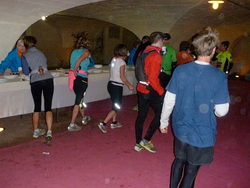 Hungerast und Dehydration sind bei diesem Lauf als Ausrede verboten. Offiziell gibt es „nur“ 9 Verpflegungsstationen („Ravitaillement“). Von den 6 Weingütern, die auf den ersten 22 Kilometern durchlaufen werden, sind nur die Hälfte als „Ravitaillements“ ausgeschrieben, tatsächlich ist aber die Verpflegung in allen Weingütern bestens. Zusätzlich gibt es noch weitere Stände, die nicht in der Streckenbeschreibung vorkommen. Allerdings trügt der Schein. Es gibt an diesen Punkten zwar Verpflegung, aber nur in Form von frischem Beaujolais.