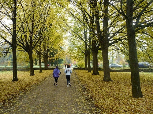 Das Lieblingsthema der Moderatoren war die Warnung vor der Strecke: „Die ersten zwei Kilometer verlaufen bergab, haltet euch bitte, bitte zurück.“ Jetzt verstehe ich warum. Das Gefälle ist nur sanft, aber sehr verführerisch. Es läuft von selbst. Das Tempo ist gemütlich, aber trotzdem höher als geplant.