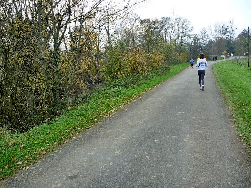 Die Strecke führt größtenteils auf asphaltierten Feldwegen. Aber nicht ausschließlich. Teilweise wird auf kaum befahrenen Straßen gelaufen. Es wurde vor dem Start explizit darauf hingewiesen, dass man in Frankreich auf der rechten Straßenseite läuft. Die Umsetzung sieht in der Praxis natürlich nicht zwangsläufig so aus. Läufer haben ihren eigenen Kopf. Wir biegen auf einen Grasweg. Endlich Abwechslung für die Füße. Es geht ein paar hundert Meter sanft hinauf, ehe wir wieder auf eine Straße wechseln. Zwar kommen immer mal wieder Alleen und Naturwege, aber dieser Grasweg bleibt das „crossigste“ Stück des ganzen Tages.