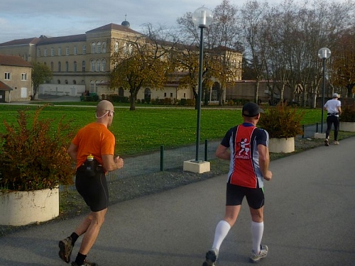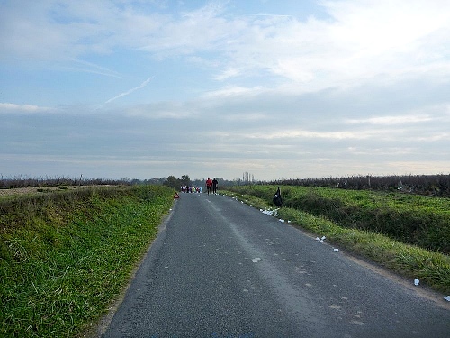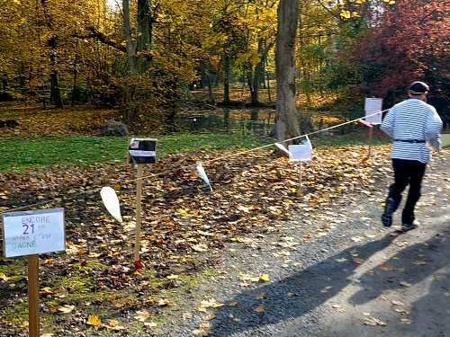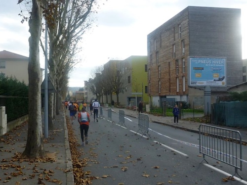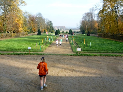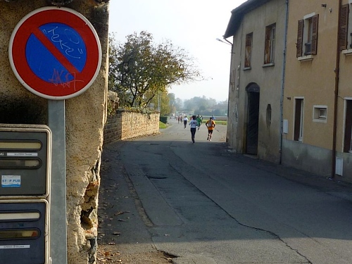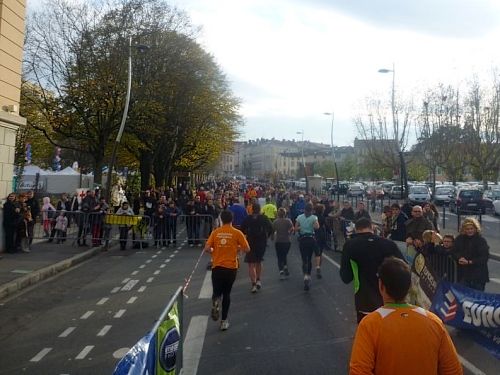 Von rechts flitzen ein paar Läufer an. Erst sind es wenige, dann werden es immer mehr. Aha, hier kommen Halbmarathon und Marathon zusammen. Damit ist es vorbei mit der Ruhe. Die Halbmarathonis rasen in unter 4min/km an uns langsam wankenden Marathonis vorbei. Ein Flitzer ruft mir aufmunternd „Bravo, allez les Marathoniens“ zu.