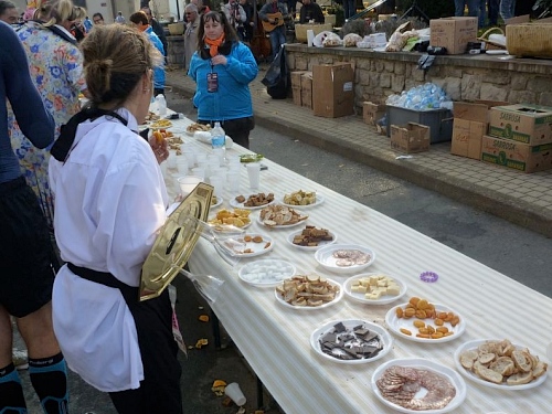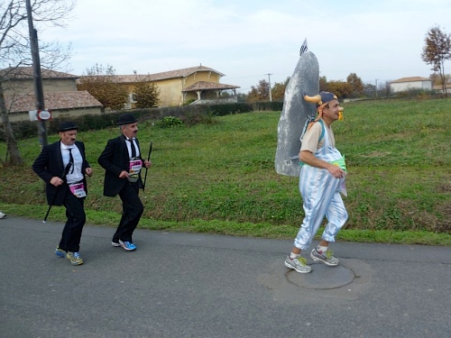 Es beschränkt sich aber nicht auf die beiden. Generell fällt auf, dass viele Mitstreiter schon zu diesem frühen Zeitpunkt einen etwas gequälten Gesichtsausdruck haben. Scheinbar verleitet die Kombination aus Kostümball, Weinprobe, gutem Essen, entspannter Stimmung und der bekannten Großzügigkeit beim Einhalten des 6-stündigen Zeitlimits auch weniger Trainierte dazu, einfach so mal einen Marathon zu probieren. Tatsächlich kommen nämlich jedes Jahr Marathonis mit Zeiten knapp unter 7 Stunden in die Wertung.