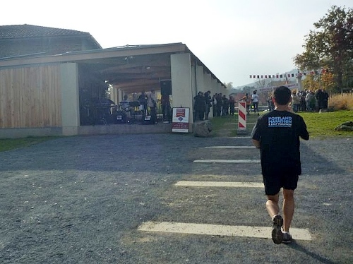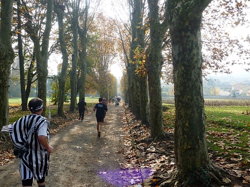Das Feld ist jetzt so weit auseinander, dass ich zum ersten Mal auf einen Ordner zulaufe und nicht weiß, ob es nach links oder rechts geht. Er steht genau in der Mitte einer Weggabelung, schaut freundlich, macht aber nicht den leisesten Wink einer Richtungsangabe. Klar, er weiß wo's hingeht. Ich entscheide mich für links um die Ecke und sehe in einer Entfernung wieder Läufer. Richtige Entscheidung. Einer dieser Läufer ist der Gallier Obelix. Er läuft in voller Montur mit Hinkelstein und vielleicht nicht ganz originalem, aber doch nennenswertem Bauchumfang. Meine schnelleren Laufkollegen berichten, dass er ziemlich flott gestartet sein soll. Scheinbar hat der Zaubertrank, in den er als Kind gefallen ist, unterwegs seine Wirkung verloren. Obwohl, den Hinkelstein trägt er weiterhin ohne Jammern.