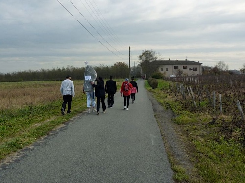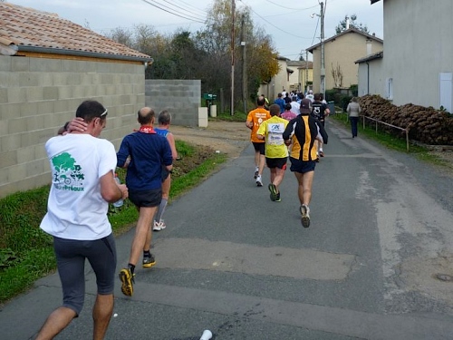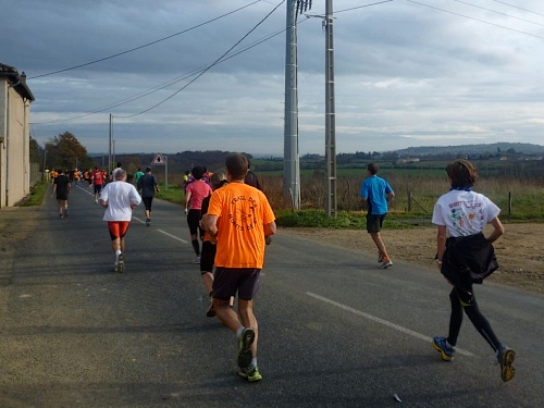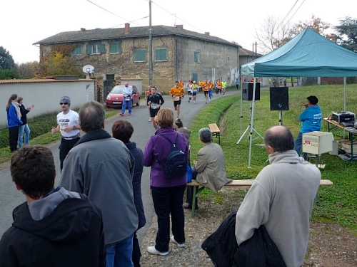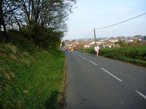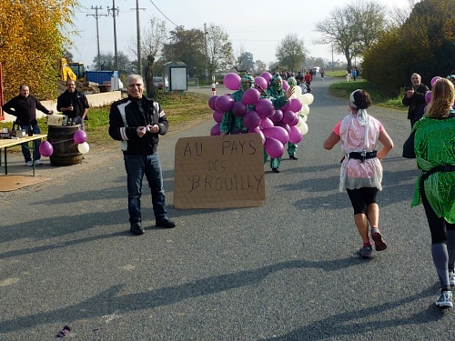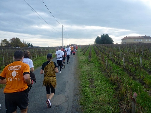 Die Anwesenheit der Halbmarathonis auf der Strecke ist Segen und Fluch zugleich. Einerseits ist es schön, dass man nicht mehr allein unterwegs ist, andererseits wird man permanent von Massen an Läuferinnen und Läufern überholt. Wer als Marathoni wegen des ständigen Überholtwerdens nun in ein Frustloch fallen möchte, hat die Rechnung nicht mit den Zuschauern gemacht. Man kann den Franzosen bisher keinen Vorwurf machen, dass sie nicht begeistert angefeuert hätten. Aber die Zuschaueransammlungen haben sich eben auf die kleinen Dörfer und Weingüter beschränkt, die wir durchlaufen haben. Ab Arnas nimmt die Zahl der Zuschauer zu und die schauen ganz genau auf die personalisierten Startnummern. Die Halben haben weiße Nummern, unsere sind pink. Umringt von etlichen Halbmarathonläufern mit weißen Nummern kommt immer wieder ein Ruf in meine Richtung „Allez le marathonien“ und „Allez Markus“.