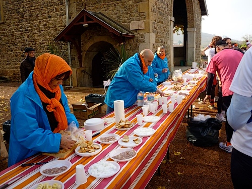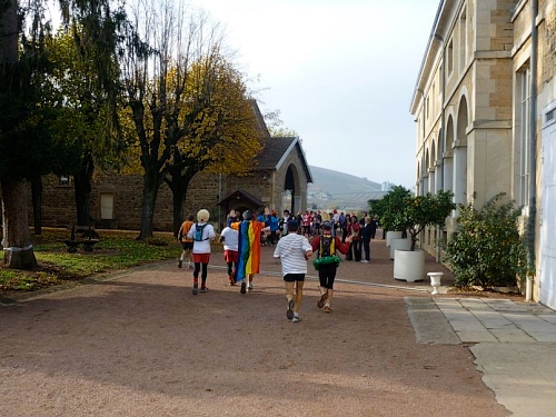 Wie gesagt, die Halben sind drei Stunden nach uns gestartet. Ja, ich bin heute sehr gemütlich unterwegs. Sie berichten später, dass sie gegen 11 Uhr in einen völlig überfüllten Linienbus am Bahnhof in Villefranche gestiegen sind, um zur Messe zu gelangen und die armen „Normalbürger“ im Bus, die nicht mit den Läufern gerechnet haben, bemitleidet haben.