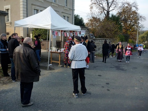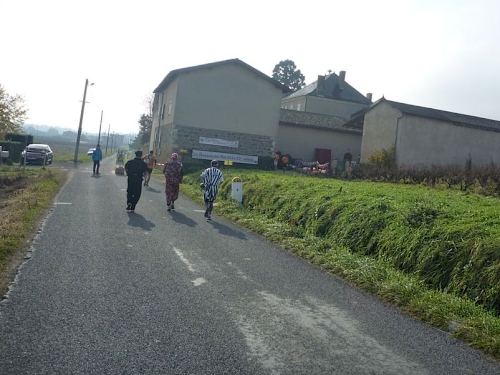 So langsam beginnt die Sonne ihren Kampf gegen den Hochnebel. An der nächsten Verpflegungsstelle hat sie diesen gewonnen. Die Labestation mündet in den ersten nennenswerten Anstieg. Nicht sonderlich steil, aber für viele doch ausreichend um eine Gehpause einzulegen. Neben der Strecke sind nun einige Hügel zu sehen. Von oben hätte man jetzt sicher eine schöne Aussicht, aber die Streckenplaner hatten Rücksicht auf die Kostümierten. Wir bleiben unten und überwinden auf der gesamten Strecke lediglich 342 positive Höhenmeter, sowie 448 negative.