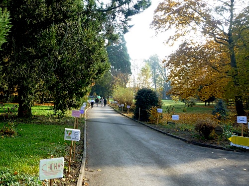 Das dritte Weingut erreichen wir kurz vor Kilometer 15. Die Verpflegung ist wiederum im Innenraum, diesmal aber ebenerdig. Im dahinter liegenden Hof steht eine riesige Musikbox, die sich bei näherem Betrachten als Teil eines blauen Sprinters herausstellt. Ein romantisches Steinbrückchen führt uns in ein Tor. Dahinter biegen wir links um die Ecke in eine herbstlich gelbe Allee ein.