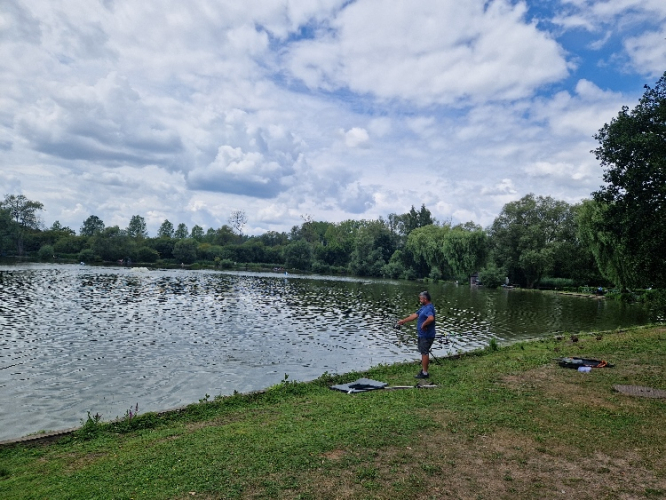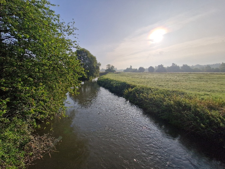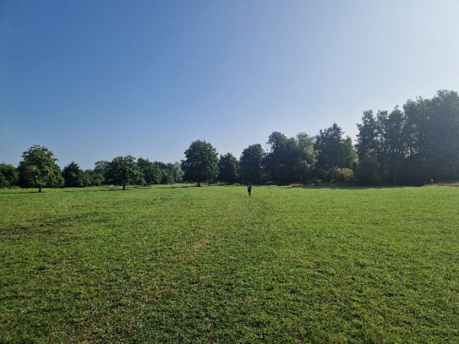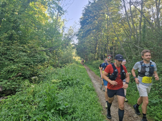 Um 9 Uhr war der Start mit etwa 70 Leuten, wobei sich die Marathonläufer schon nach drei Kilometern verabschieden und man den Rest der Strecke weitgehend alleine unterwegs ist. Am ersten Verpflegungspunkt haben wir uns noch zu viert getroffen, am zweiten war das Feld dann zu weit auseinander gezogen. Da das Waldgebiet nicht von Wanderern, Radfahrern oder Reitern überlaufen ist und man so nur selten auf andere Menschen trifft, hat man reichlich Zeit, den Wald, die Bäume, die Felder, die Flüsschen, die Angelteiche und die Weinberge (!) inkl. einer Hochzeitsfeier zu bewundern und sich also einmal wirklich tiefe Gedanken machen.