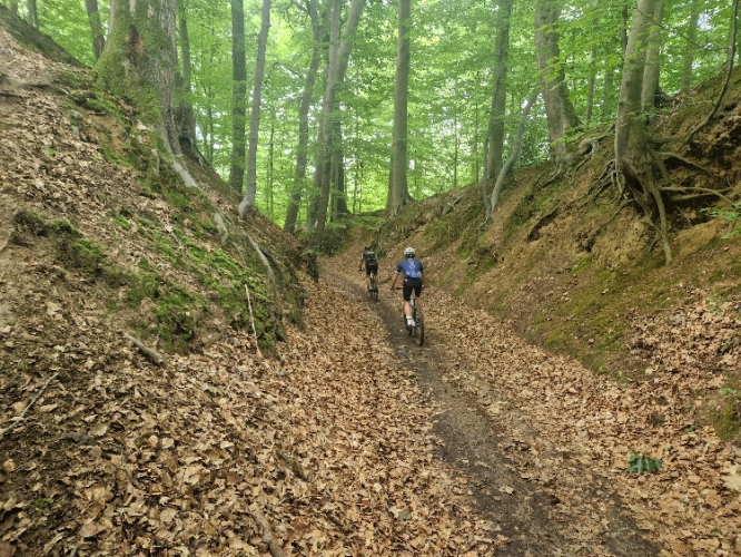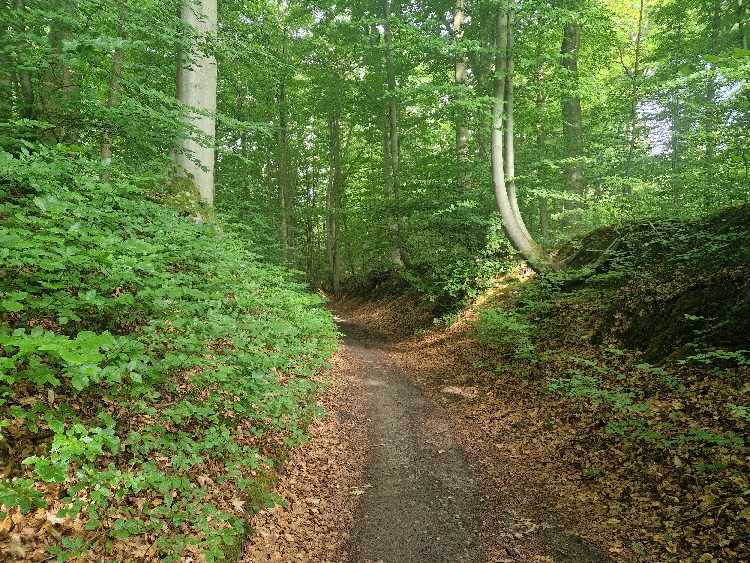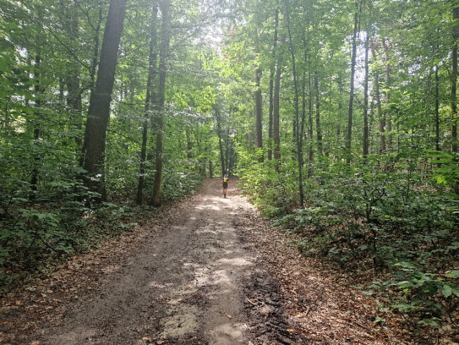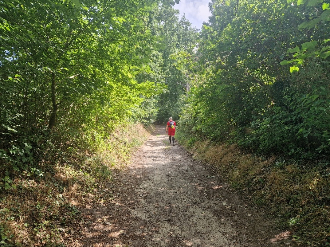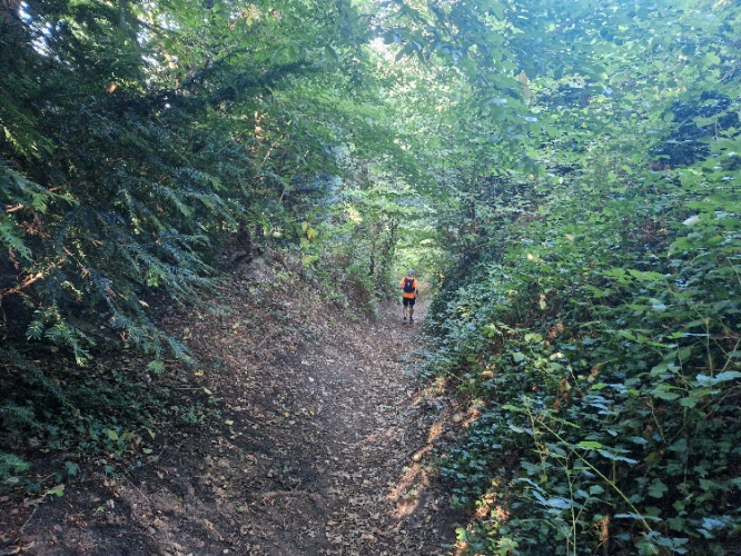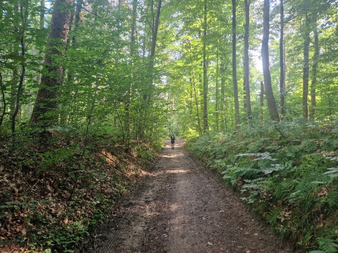 Meine Sammlung aus Gels, Snickers, Proteinriegeln, diesmal sogar Minisalamis und dazu Elektrolyttabletten hat sich bewährt. Eine Sonnenkappe ist gut, hat aber nicht jeder dabei gehabt, da man etwa 2/3 der Zeit ohnehin gut beschattet im Wald verbringt. Stöcke braucht man keine, die Steigungen sind nie zu steil und auch nie zu lang. Für die Düsseldorfer: Die Gegend und auch die Strecke erinnern teilweise etwas an den Stadtwald, wenn auch deutlich vielfältiger.