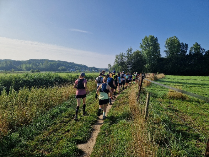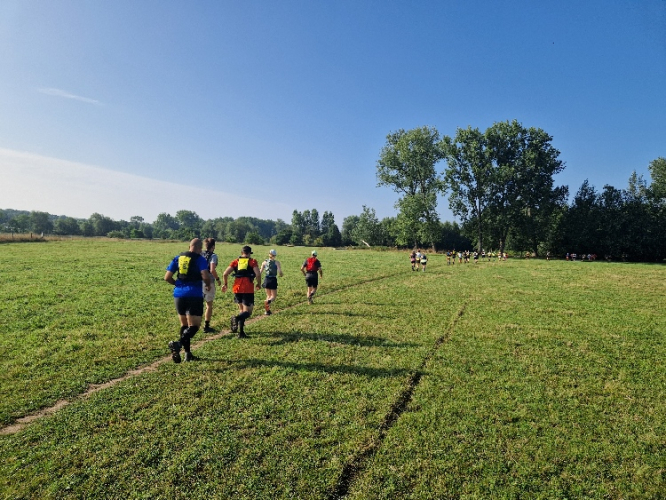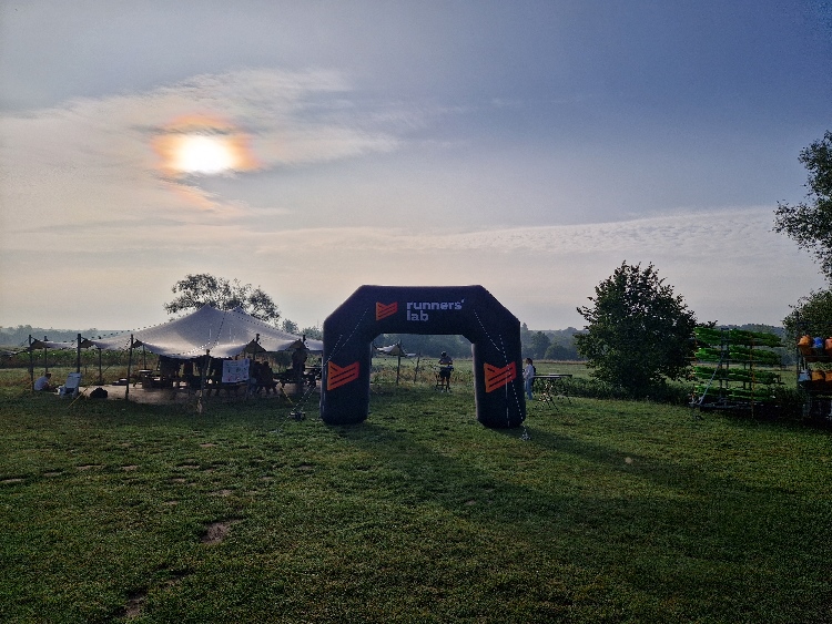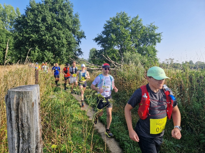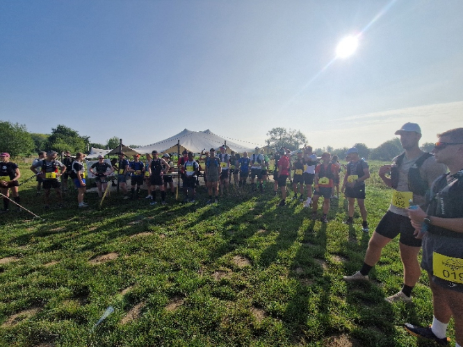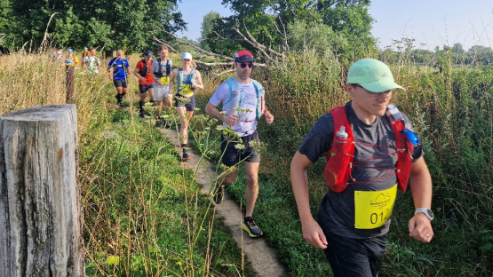 Nachdem ich die letzten Monate öfter in den 50er Kilometern und um die 2000 Höhenmeter unterwegs war, scheinen mir die 75 km mit etwa 1.200 Höhenmetern die richtige Herausforderung zu sein. Dabei gibt es zwei Versorgungsstationen, so dass man im Maximum 27 km auf sich selbst gestellt ist. Bei 26 °C ist also neben den normalen zwei Halbliter-Softflaschen mindestens noch eine weitere Halbliterflasche im Rucksack angeraten. Und genügend Kalorien für zwischendurch.