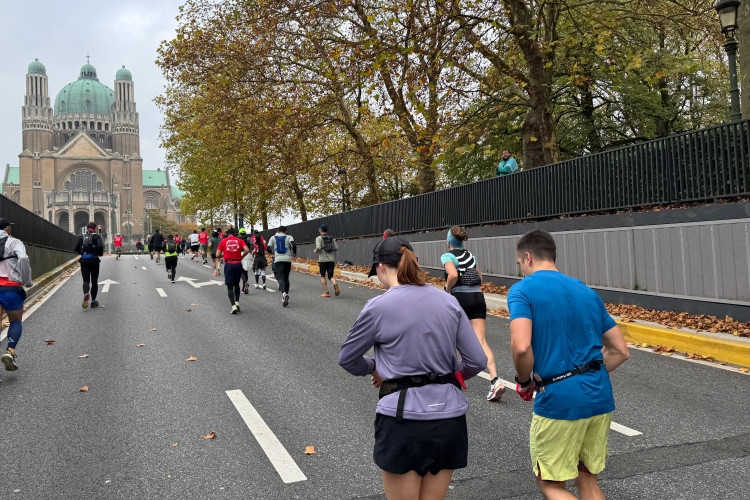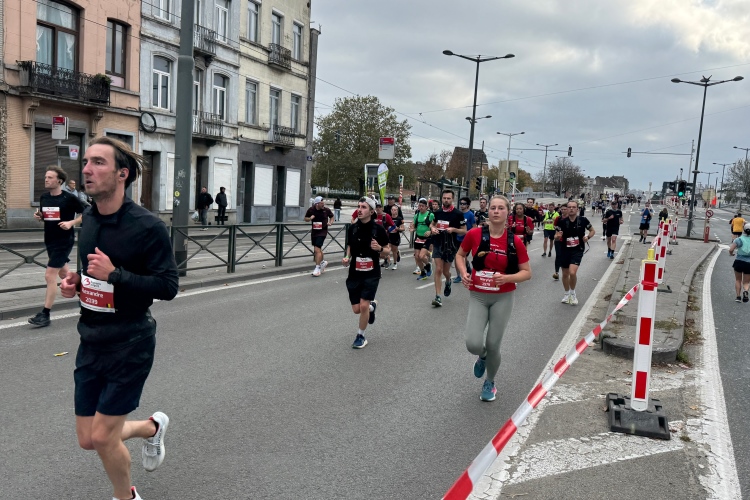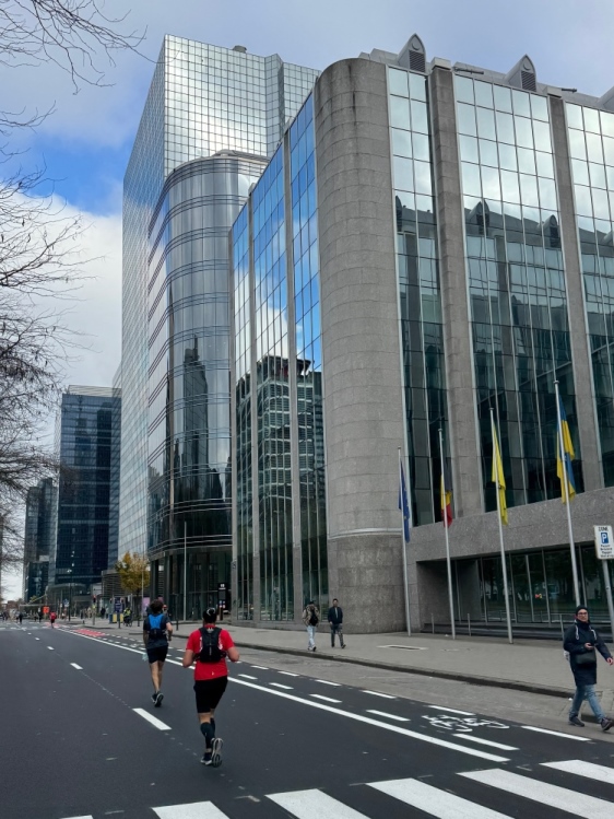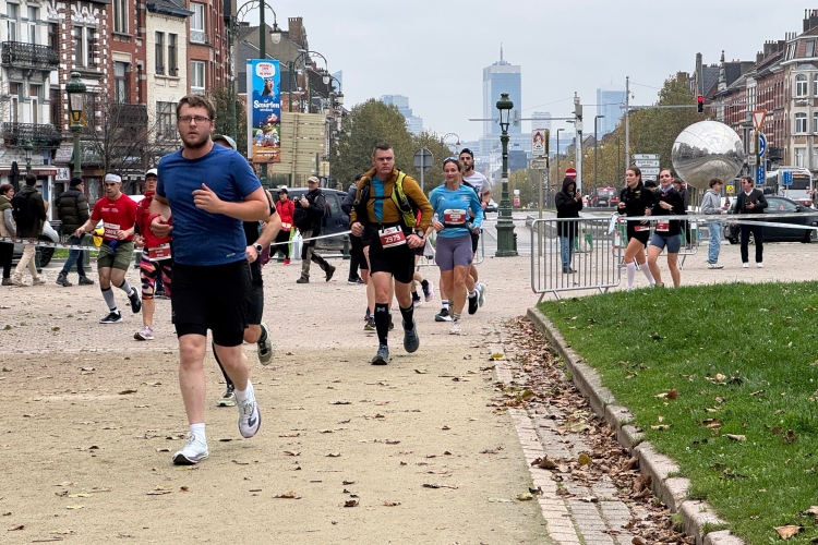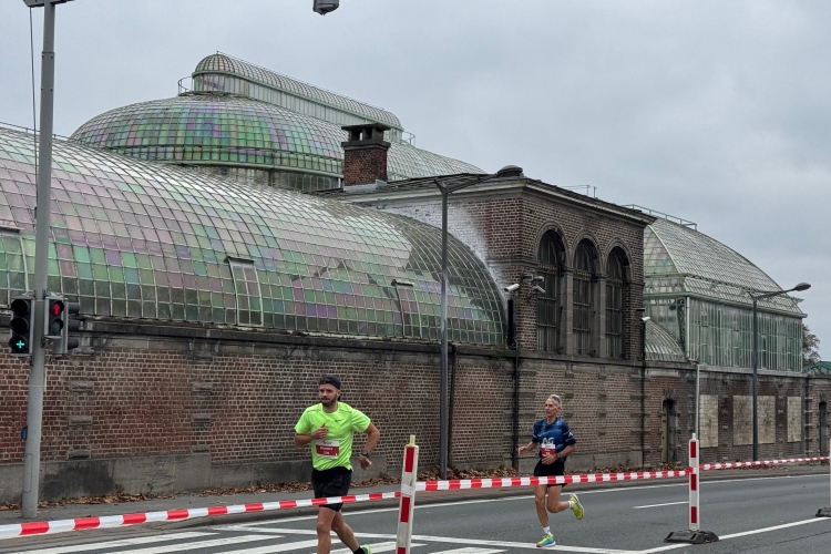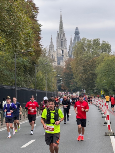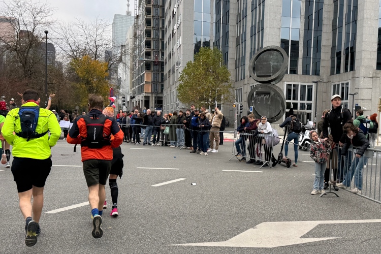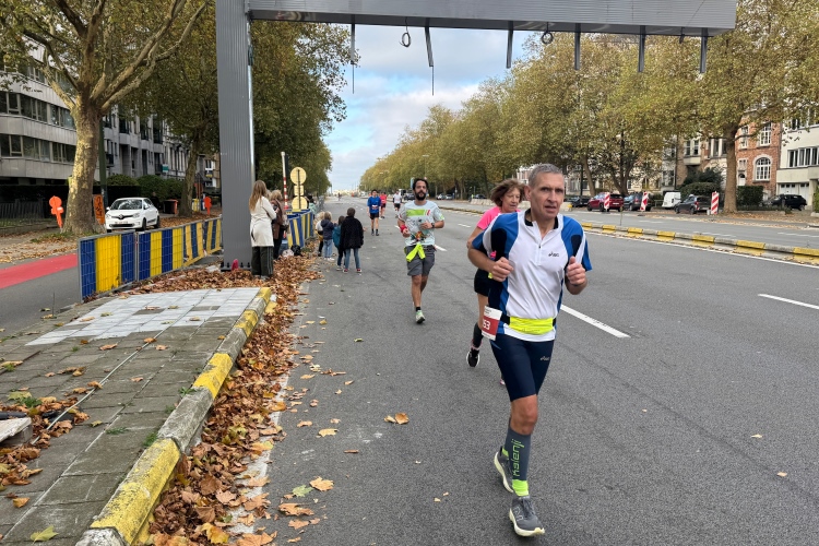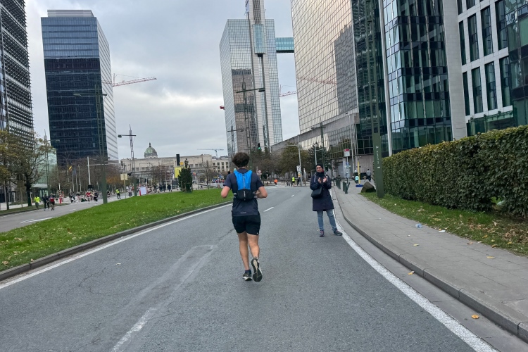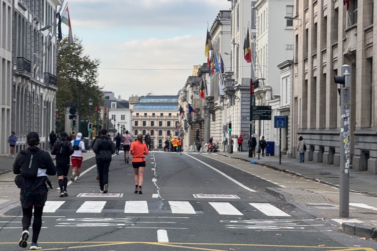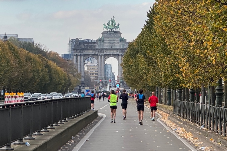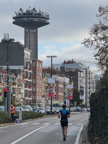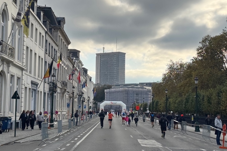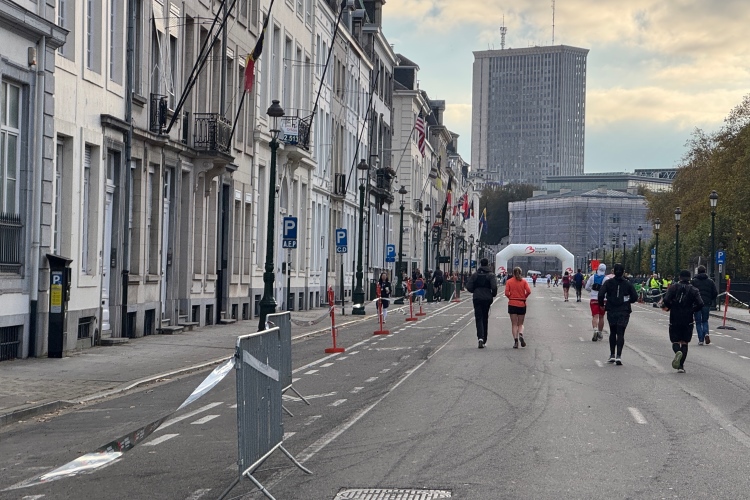 Die letzten neun Kilometer liegen vor uns: Den Park haben wir durchquert, und nun befinden wir uns auf einer Stadtschnellstraße. Rechts der alte Hafen, links noch genutzte Hafenbecken. Brüssel kann über den Meereskanal Brüssel-Schelde von Schiffen bis 4.500 Tonnen aus der Nordsee angesteuert werden. Über die Gleisanlagen von Schaarbeek. Mit der Hochhaussilhouette von Brüssel in weiter Ferne kommen wir wieder auf die bekannten schönen Alleestraßen, die gefühlt immer bergauf gehen. Einige Zuschauer feuern uns an, unzählige Streckenposten und PolizistInnen ebenfalls. Meine Beine tun mir weh. Drei Wochen Trainingspause kann ich jetzt gut spüren. Aber trotzdem laufe ich langsam an diversen gehenden Mitstreitern vorbei.