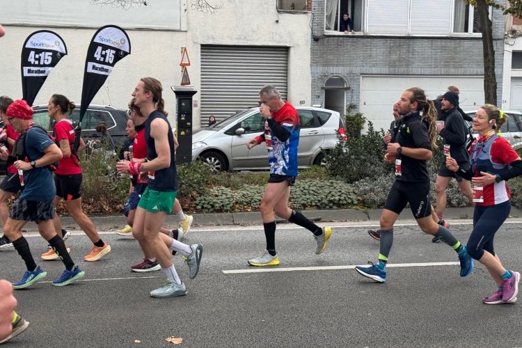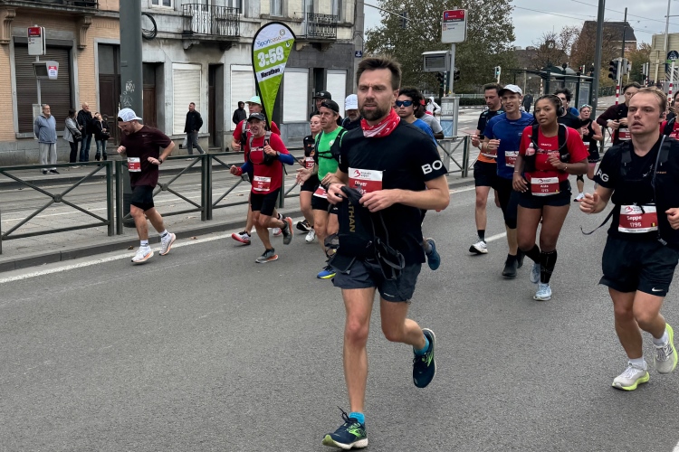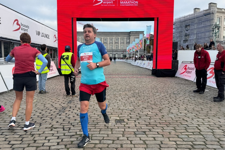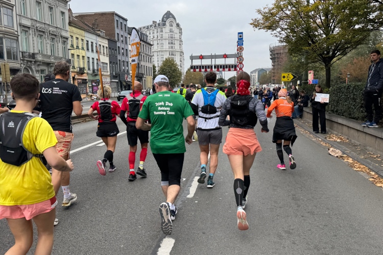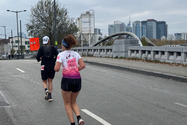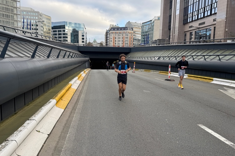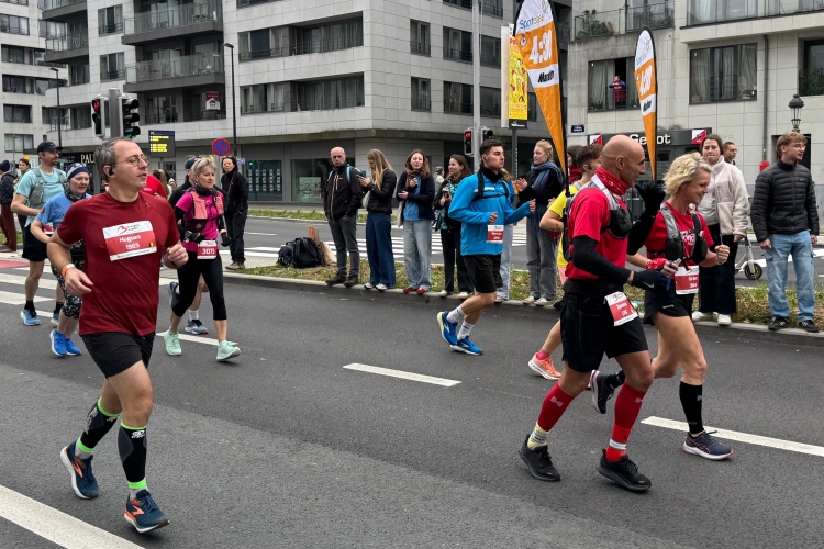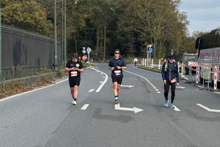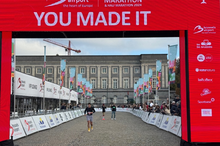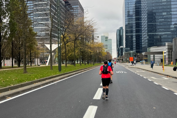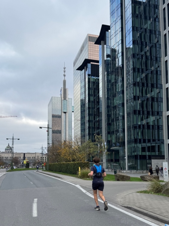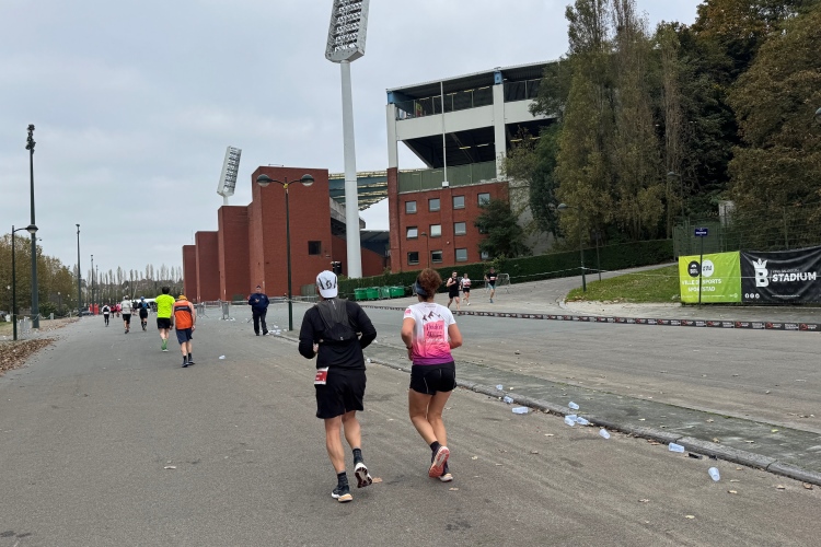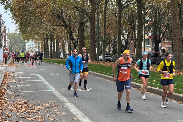 Die letzten neun Kilometer liegen vor uns: Den Park haben wir durchquert, und nun befinden wir uns auf einer Stadtschnellstraße. Rechts der alte Hafen, links noch genutzte Hafenbecken. Brüssel kann über den Meereskanal Brüssel-Schelde von Schiffen bis 4.500 Tonnen aus der Nordsee angesteuert werden. Über die Gleisanlagen von Schaarbeek. Mit der Hochhaussilhouette von Brüssel in weiter Ferne kommen wir wieder auf die bekannten schönen Alleestraßen, die gefühlt immer bergauf gehen. Einige Zuschauer feuern uns an, unzählige Streckenposten und PolizistInnen ebenfalls. Meine Beine tun mir weh. Drei Wochen Trainingspause kann ich jetzt gut spüren. Aber trotzdem laufe ich langsam an diversen gehenden Mitstreitern vorbei.