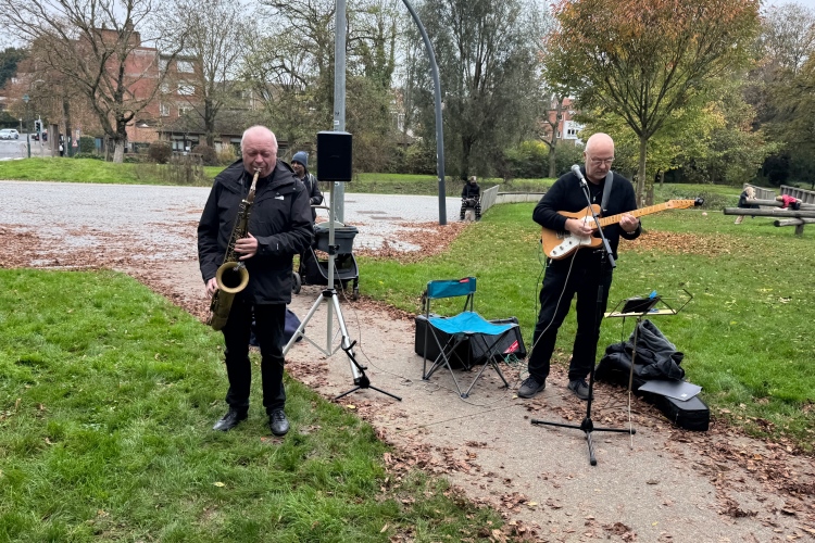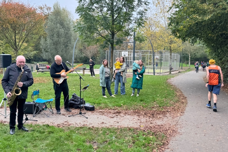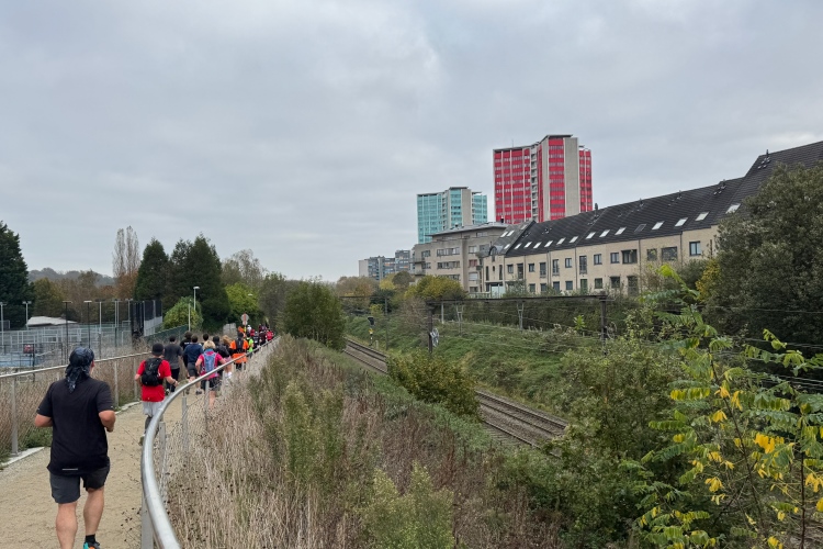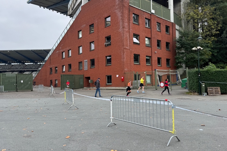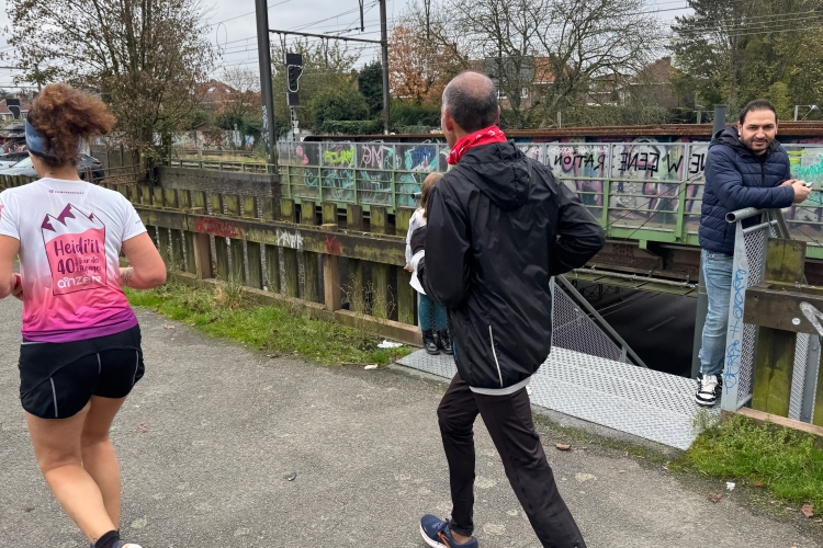 Einige Zuschauende am Straßenrand. Die Kinder feuern fleißig an. Viel gibt es hier zu sehen. Ein Gemisch aus kleinen Häusern und riesigen Wohnblöcken. Die Straßen machen einen sehr gepflegten Eindruck. Rechts ein Bahnübergang, bei dem sich gerade die Schranken schließen. Daher also der Schlenker, den ich auf dem Streckenplan sah. Wir müssen die Straße noch ein Stück weiter hinauf, dann auf einen Kiesweg, der uns auf eine Fußgängerüberführung über die Gleise bringt. Unten angekommen befinden wir auf der anderen Seite der Schranke. Der FC Ganshoren macht Stimmung. Dann unter der Bahn durch kommen wir nach Jette.