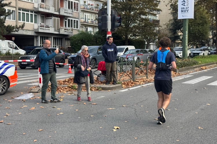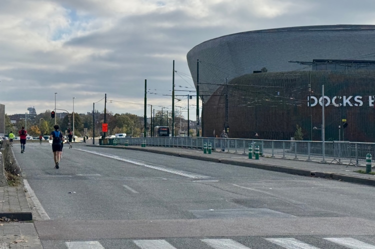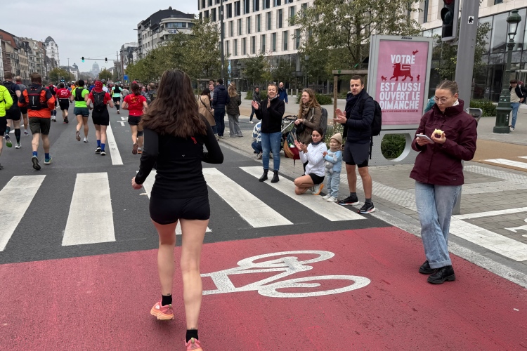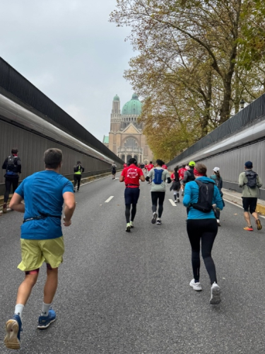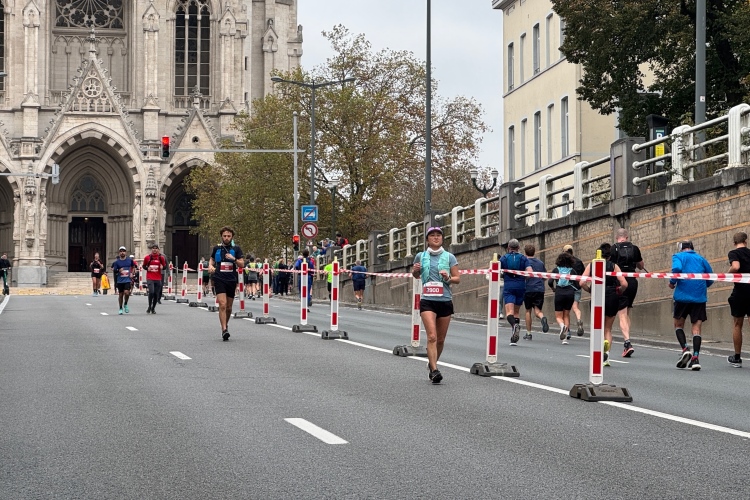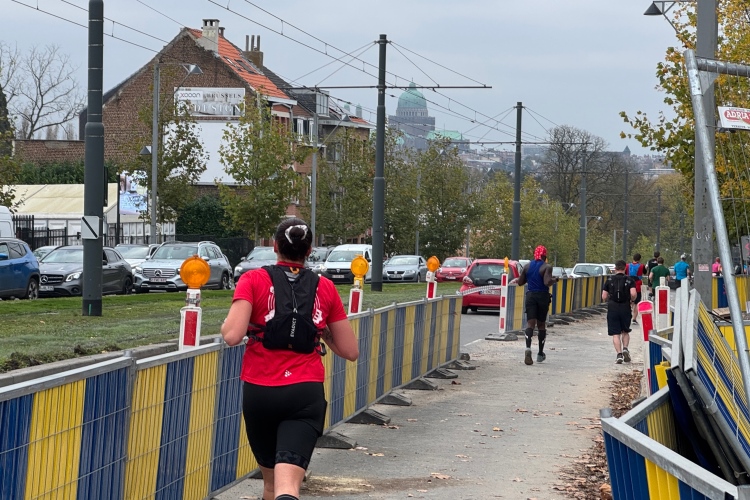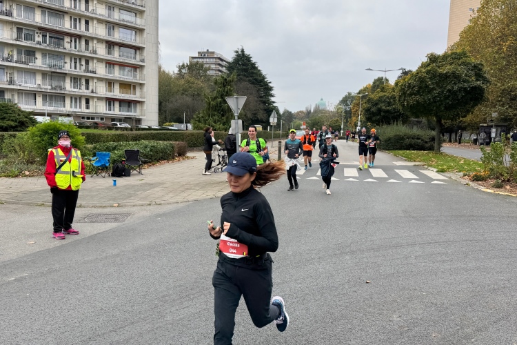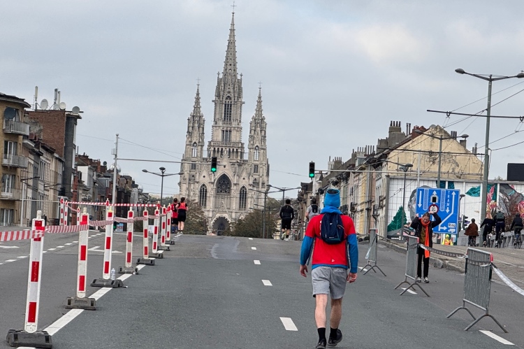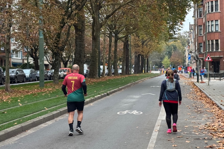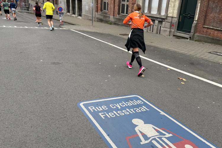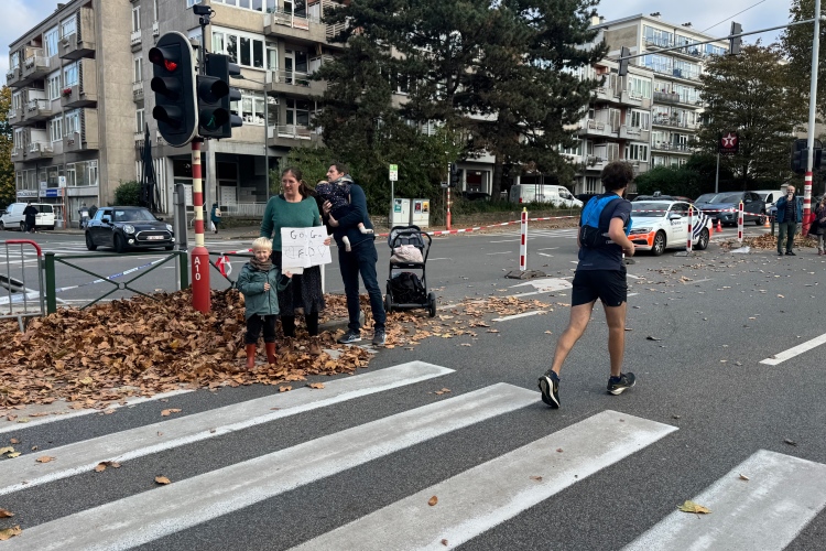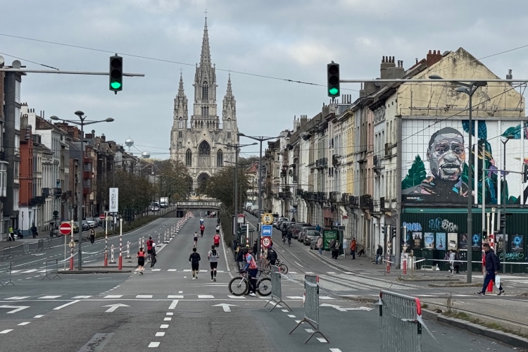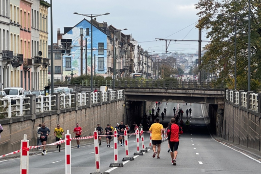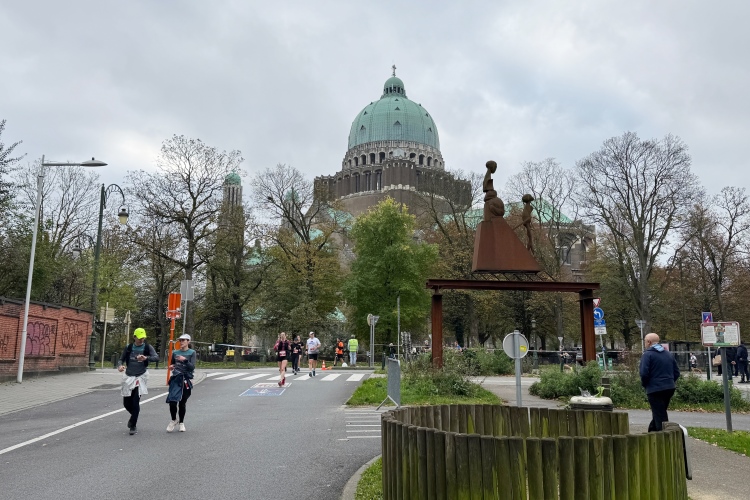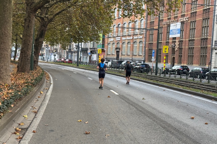 Die 1,2 Millionen Bewohnerinnen und Bewohner der Hauptstadtregion Brüssel verteilen sich auf 19 eigenständige Gemeinden. Wir kommen heute laut meiner Zählung durch sieben davon. Gestartet sind wir in Molenbeek-Saint-Jean. Nun sind wir in Ganshoren und auf der blockierten Gegenspur wird unentwegt gehupt. Ja, sind wir denn in Italien? Die Läuferin neben mir nimmt es gelassen und der Ordner blockiert die Autos, so gut es geht.