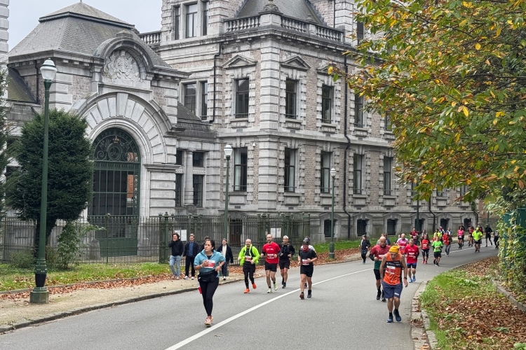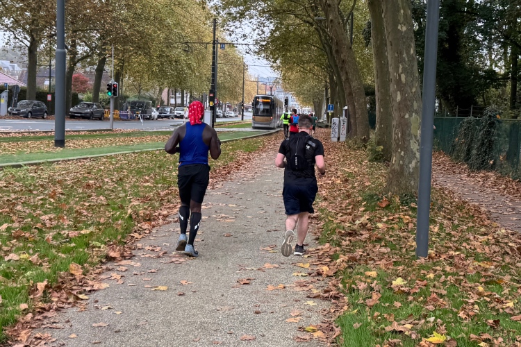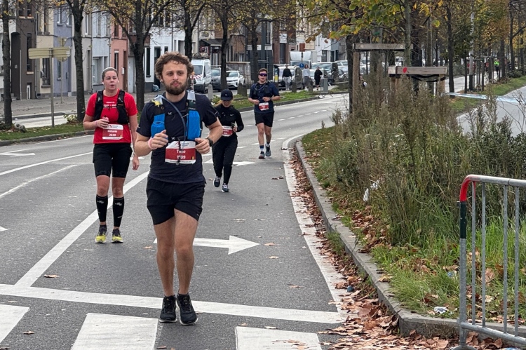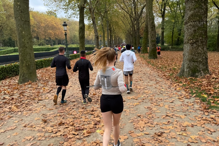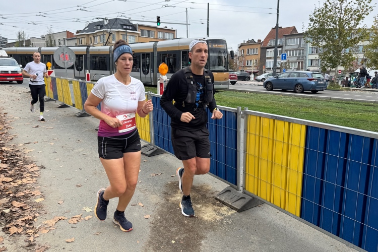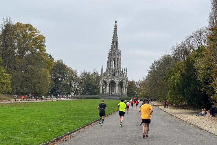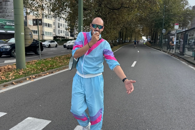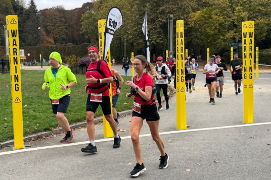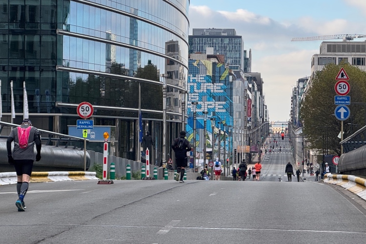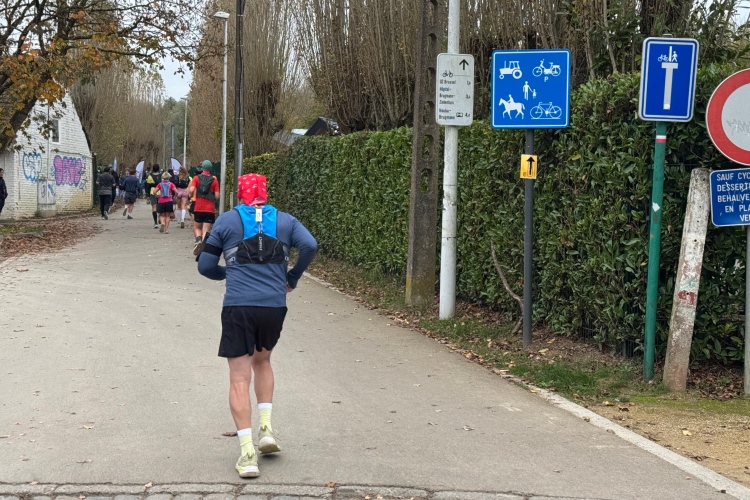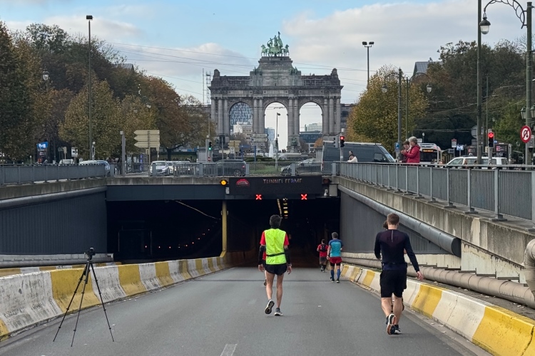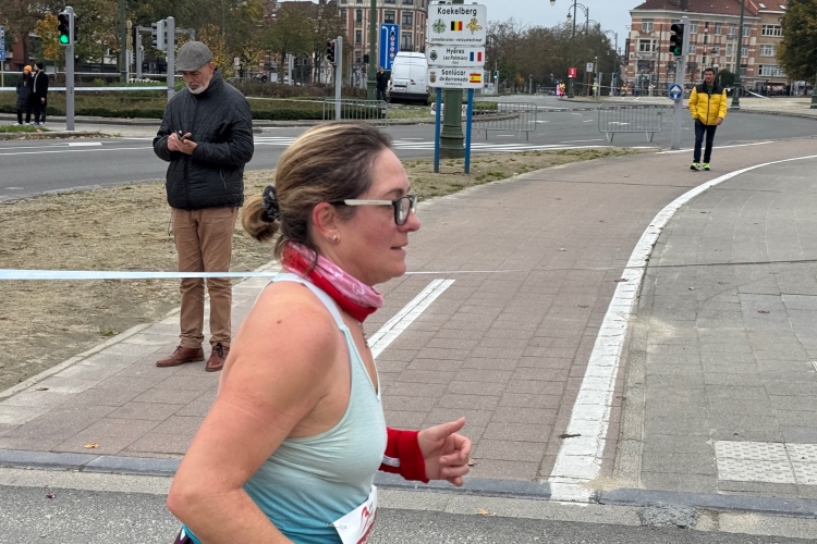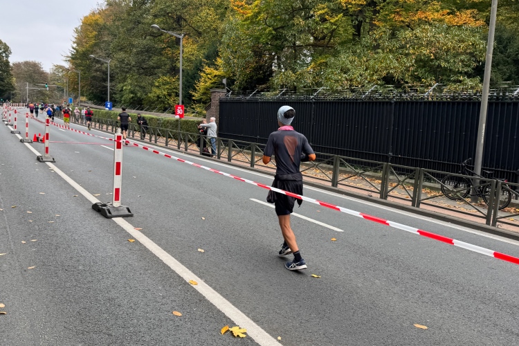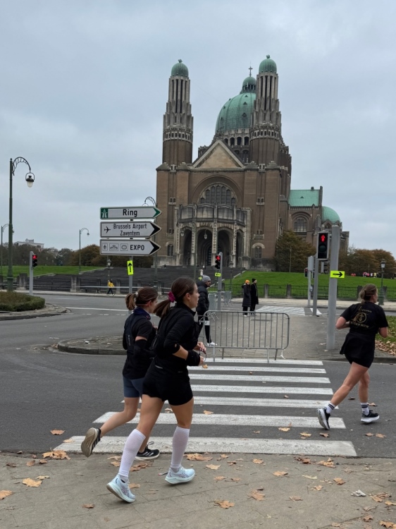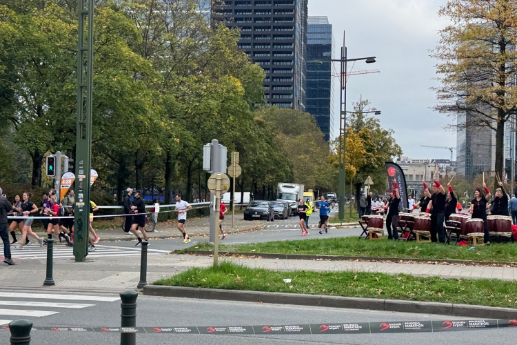 Die 1,2 Millionen Bewohnerinnen und Bewohner der Hauptstadtregion Brüssel verteilen sich auf 19 eigenständige Gemeinden. Wir kommen heute laut meiner Zählung durch sieben davon. Gestartet sind wir in Molenbeek-Saint-Jean. Nun sind wir in Ganshoren und auf der blockierten Gegenspur wird unentwegt gehupt. Ja, sind wir denn in Italien? Die Läuferin neben mir nimmt es gelassen und der Ordner blockiert die Autos, so gut es geht.