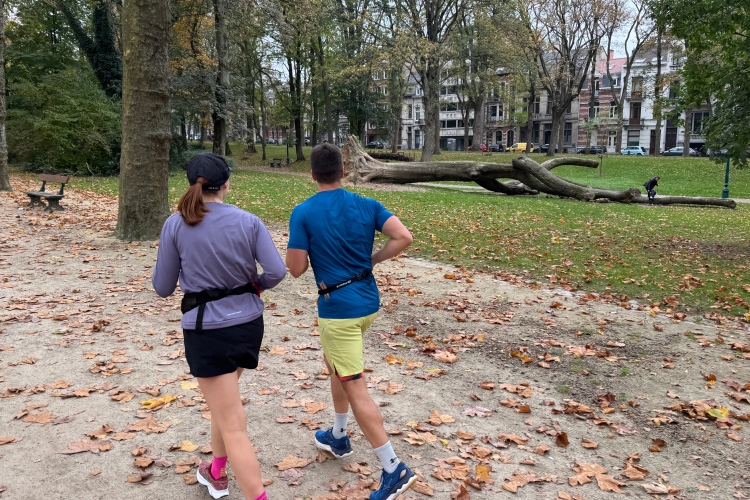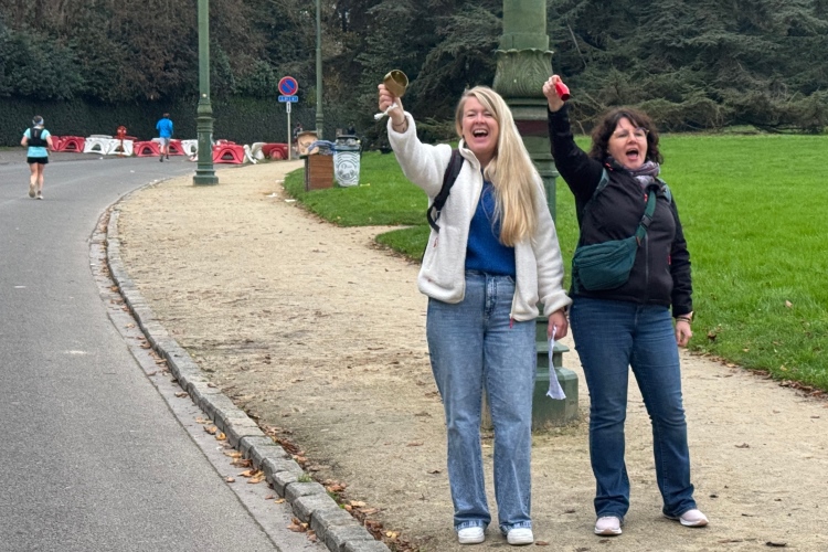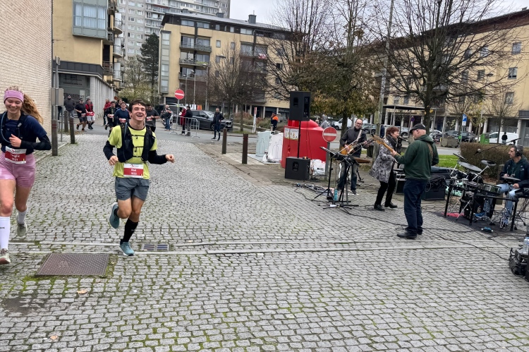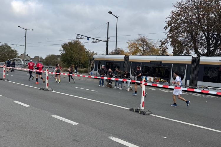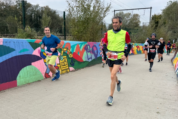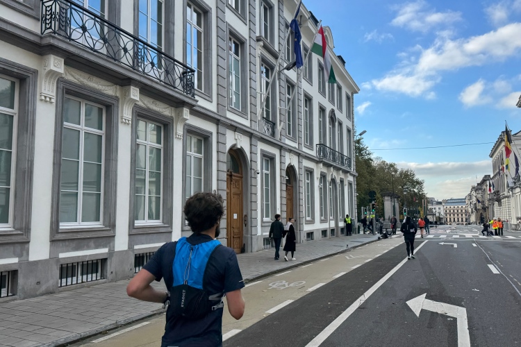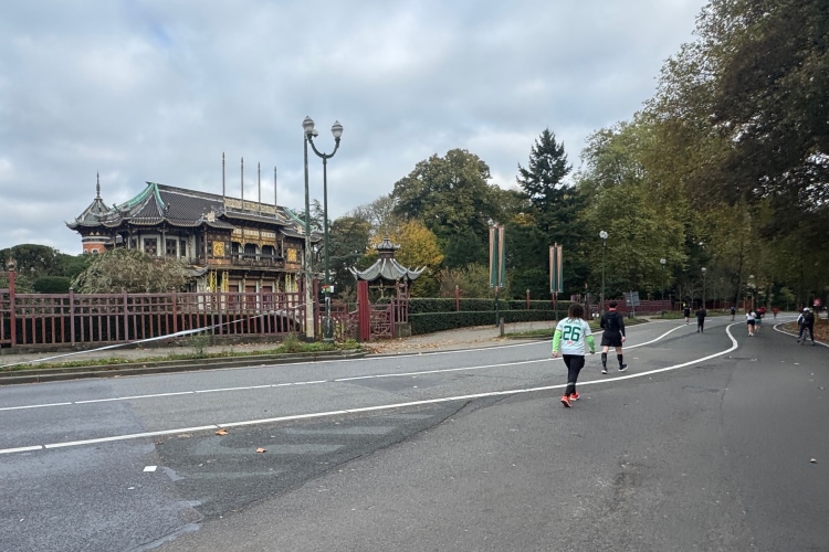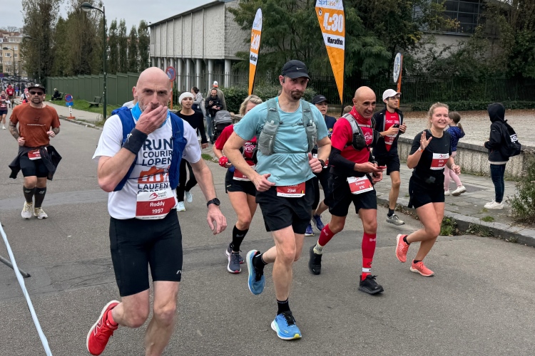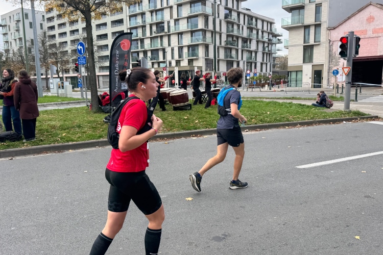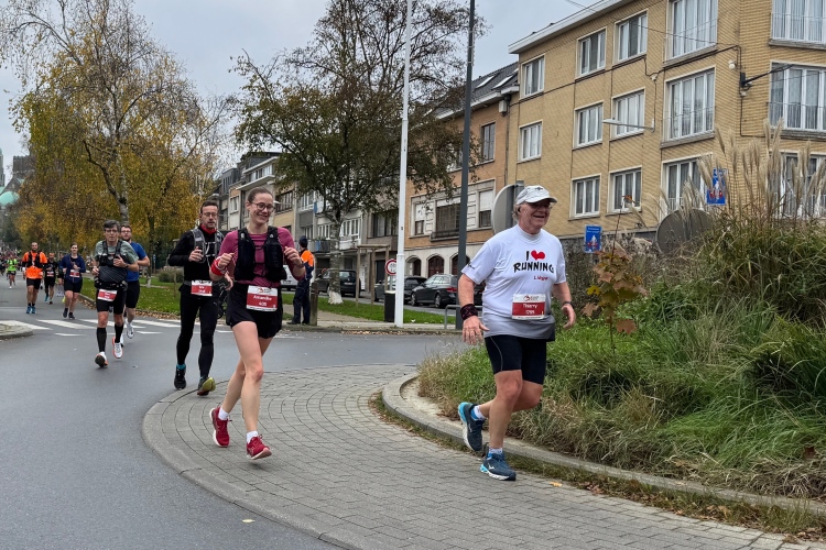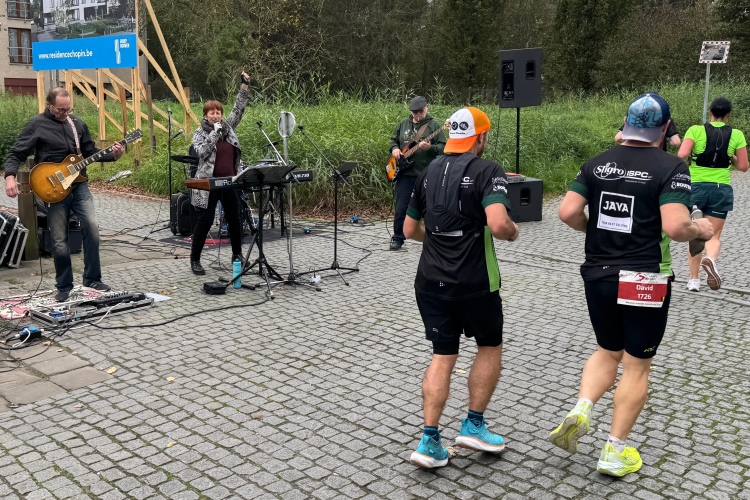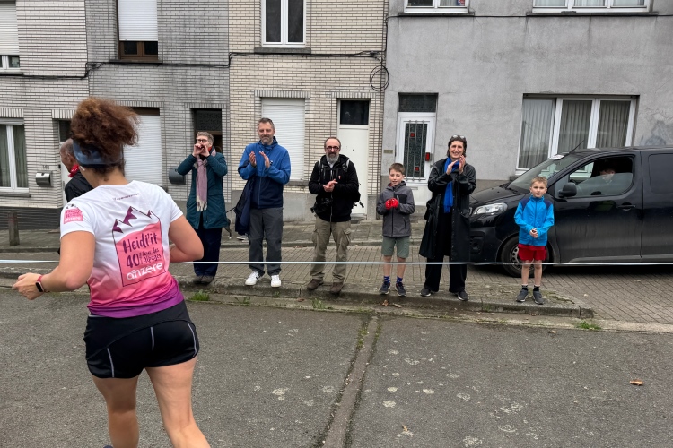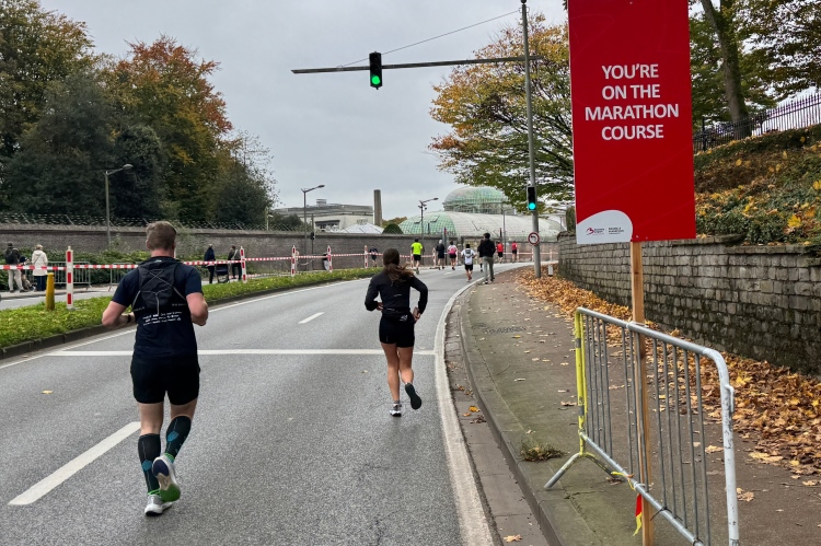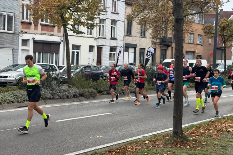 Die 1,2 Millionen Bewohnerinnen und Bewohner der Hauptstadtregion Brüssel verteilen sich auf 19 eigenständige Gemeinden. Wir kommen heute laut meiner Zählung durch sieben davon. Gestartet sind wir in Molenbeek-Saint-Jean. Nun sind wir in Ganshoren und auf der blockierten Gegenspur wird unentwegt gehupt. Ja, sind wir denn in Italien? Die Läuferin neben mir nimmt es gelassen und der Ordner blockiert die Autos, so gut es geht.