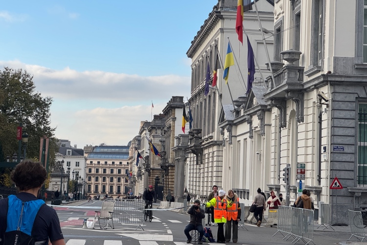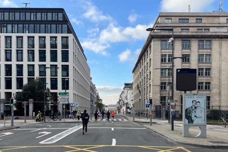 Ich sehe die Gebäude einiger Privatbanken am Wegesrand. Dann wieder in einen Tunnel. Schade. Die Gebäude des Parc du Cinquantenaire bleiben uns verborgen. Wir unterlaufen später quasi das „Herz“ der Europäischen Verwaltung und das Europaparlament. Die letzten 2 Kilometer dann wieder bei Tageslicht. Hier führt die Stadtschnellstraße zwischen Verwaltungsgebäuden hindurch. Einige Lobbyistenbüros gibt es zu sehen. Ältere Gebäude künden das Finale an. Rechts der Warandepark, links Botschaften. Mit der gut bewachten Botschaft der USA beginnt es, dann folgen unzählige weitere Fahnen.