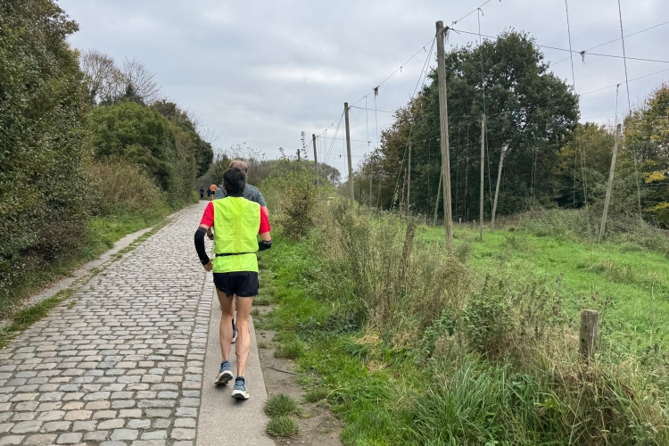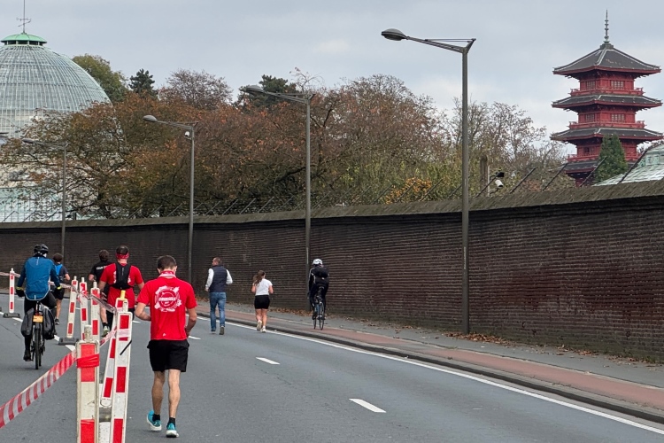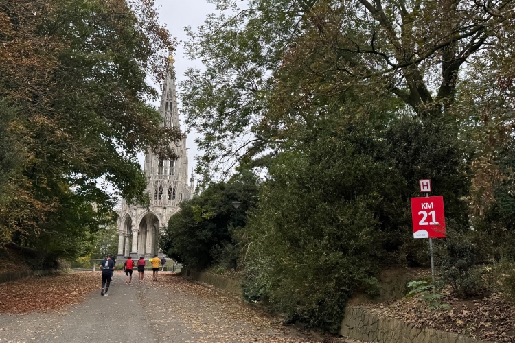 Jetzt bleiben wir erst mal viele Kilometer im Laken-Park. Laken ist ein Stadtteil von Brüssel. Die Straßen und Wege haben einen guten Untergrund bis auf ein paar Meter mit Schlaglöchern, bei denen es mich dann fast erwischt. Und Brüssel ist sehr hügelig, so auch hier im Park. Bei Kilometer 19 treffen wir auf den „Gegenverkehr“. Die Damen und Herren sind schon bei Km 30.