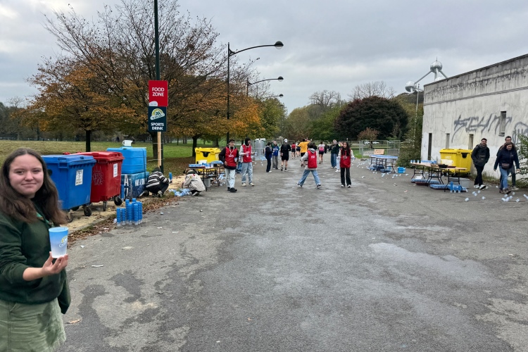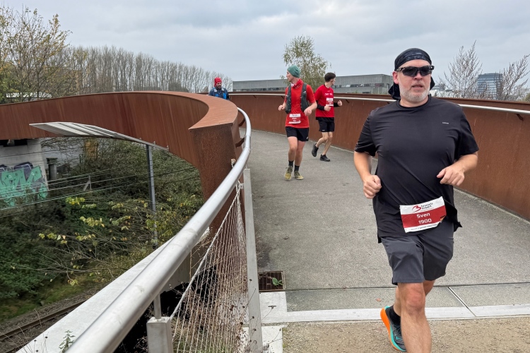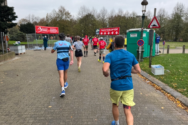 Nach einem Anstieg erreichen wir das Gelände der Vrije Universiteit. Der Campus wird anscheinend gerade neu gebaut. Nochmals über eine Fußgängerbrücke zum Verpflegungspunkt bei km 10. Die VPs sind sehr groß und immer gleich aufgebaut: Wasser, Bananen, Salzkekse, Weingummi, dann noch Iso-Getränke. Die Becher sind aus Hartplastik und sollen am Ende der VPs in große Sammelbehälter geworfen werden, was gut klappt. An jedem VP gibt es zwei Toilettenhäuschen und ein Pissoir. Solche Dinger wären eine gute Ergänzung für alle Marathons und hier im speziellen für den ersten Tunnel.