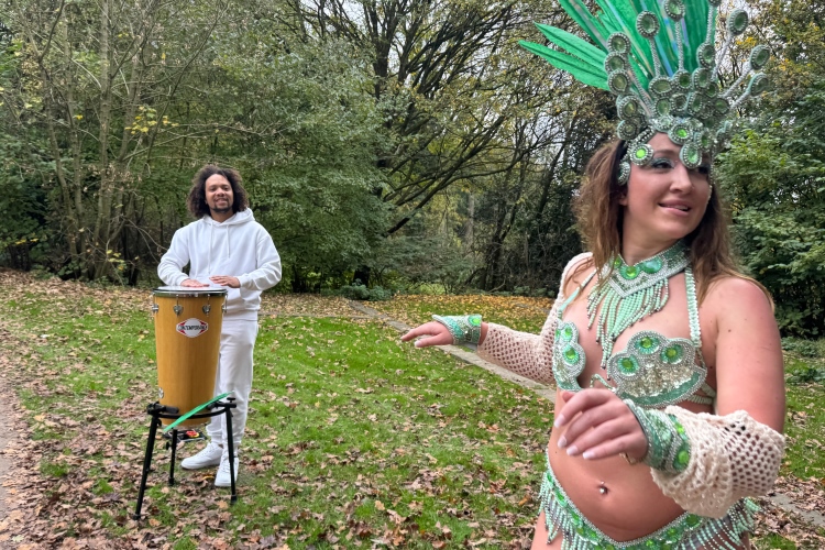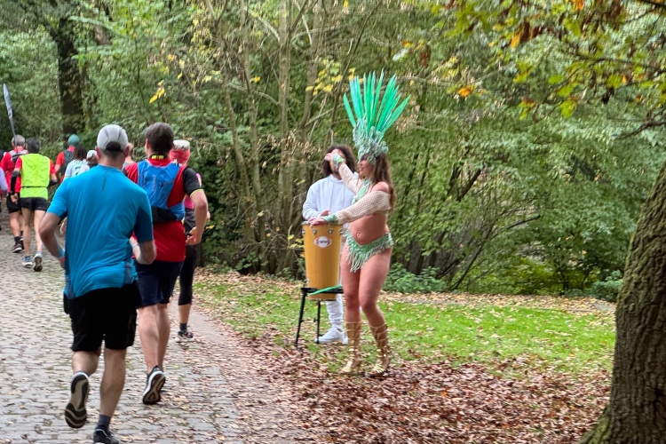 Laut Streckenplan erwarte ich heute sehr viel Parkanteil. Aktuell wechseln sich Grünanlagen und Wohnstraßen noch ab. Auf einmal laufen wir an einem kleinen Hopfenfeld vorbei. Haben wir uns etwa in die Hallertau verirrt? Und wie passen die zwei Brasilianerinnen in landestypischer Karnevalstracht dazu?