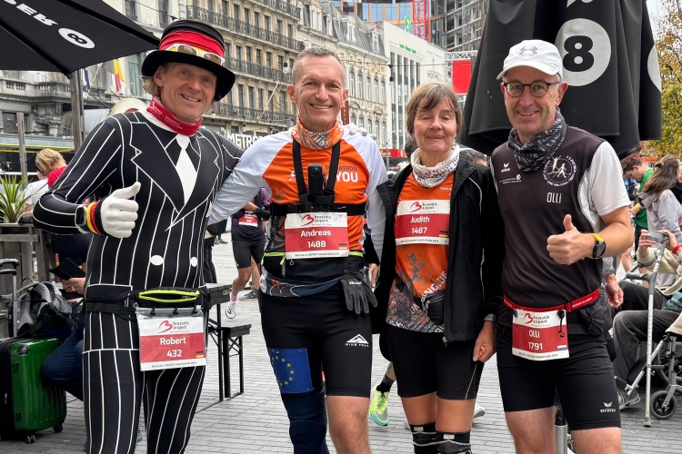 Der Startkorridor ist vom zentralen Place de Brouckère aus erreichbar. Unser Hotel liegt günstigerweise gleich daneben, sodass wir uns eine Taschenabgabe sparen. Reichlich Toiletten sind vorhanden. Wir treffen Olli samt Lauffreund und Robert, der immer in Nadelstreifendress und schwarz- rot-goldenem Hut läuft. Olli bevorzugt Jubiläumsmarathons. Heute ist aber erst der 19. Brüssel Marathon. Der erste fand 2004 statt. Wobei die französischsprachige Wikipedia-Seite auch 11 Marathons von 1994 bis 2004 aufführt. Dann käme ja doch eine runde Zahl zustande.