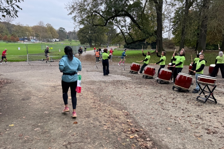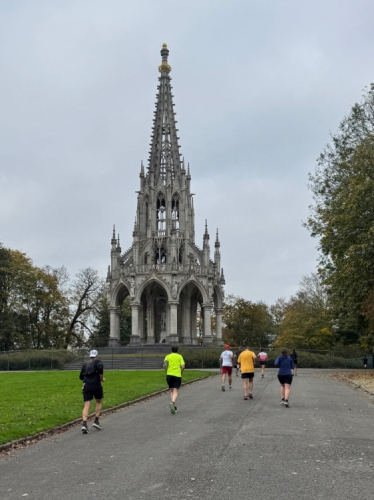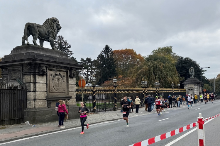 Hinauf zum Monument à la Dynastie, gebaut 1878 in Erinnerung an König Leopold I, den ersten König von Belgien. Und dann gleich wieder sehr steil hinunter. Die Trommelgruppe an einem Abzweig hält tapfer durch. Dann kurz vor dem Halbmarathonpunkt wieder steil hinauf zum Monument. Meine Uhr zeigt inzwischen über 260 Höhenmeter an. Hier treffen alle Laufstrecken vor dem Kasteel van Laken zusammen, dem Wohnsitz der königlichen Familie. Es folgt eine acht Kilometer lange Stichstrecke Richtung Zentrum mit Gegenverkehr.