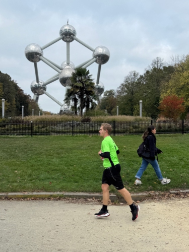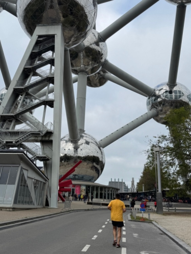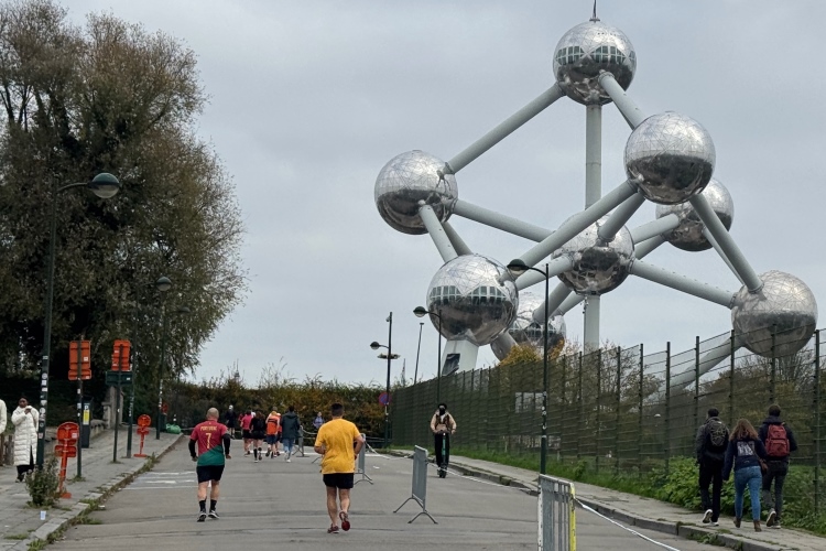 Bereits seit 1977 findet im Stadion das Memorial Van Damme statt, eines der renommiertesten Leichtathletikmeetings, das zur Serie der Diamond League zählt und an den tödlich verunglückten belgischen Mittelstreckenläufer Ivo Van Damme erinnert. Die Straße davor heißt Avenue de Marathon, ist aber recht kurz. Ich sehe Judith aus dem Stadion kommen, grüße brav und dann geht es auch für mich hinein. Eine Runde zu fetziger Musik, und schon bin ich wieder draußen und laufe auf das weltberühmte Atomium zu.