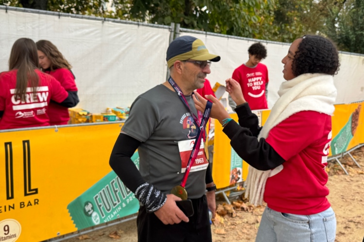 Erwartungsgemäß ist im Verpflegungsbereich nicht mehr viel los. Es gibt zwei Flaschen Iso-Getränk und vier Päckchen mit schmackhaften Energieriegeln. Aus Umweltschutzgründen hat man auf wärmende Plastiküberzüge verzichtet und hier gleich die Taschenabgabe eingerichtet. Wir machen uns schnell auf den zwei Kilometer langen Weg zum Hotel. Unglaublich, welche Menschenmassen in der Innenstadt unterwegs sind, um sich bei freundlichem Herbstwetter im Zentrum zu vergnügen.