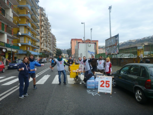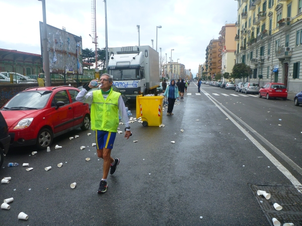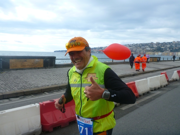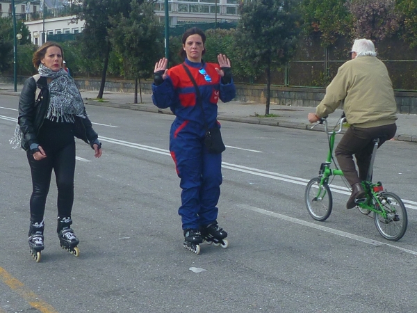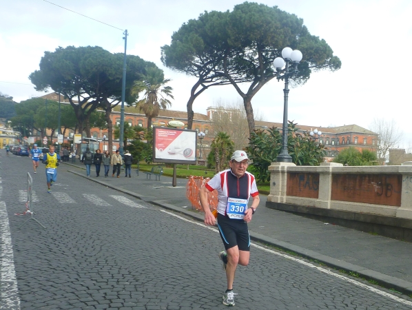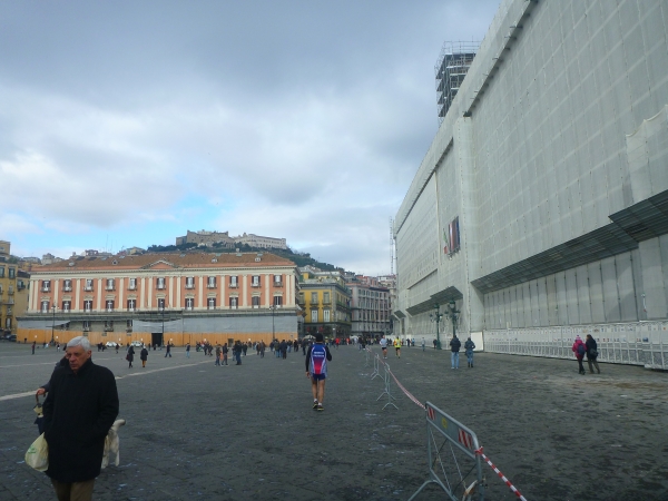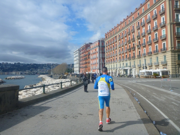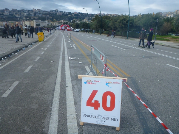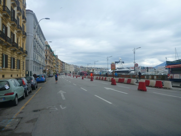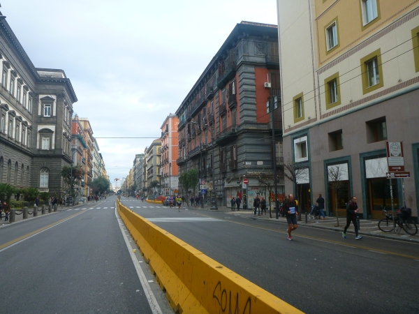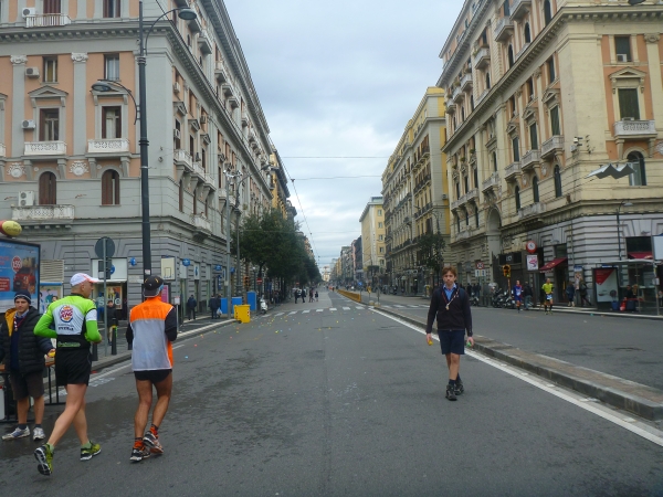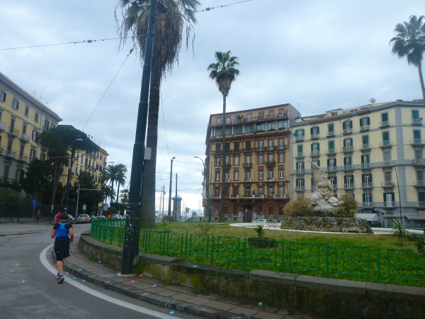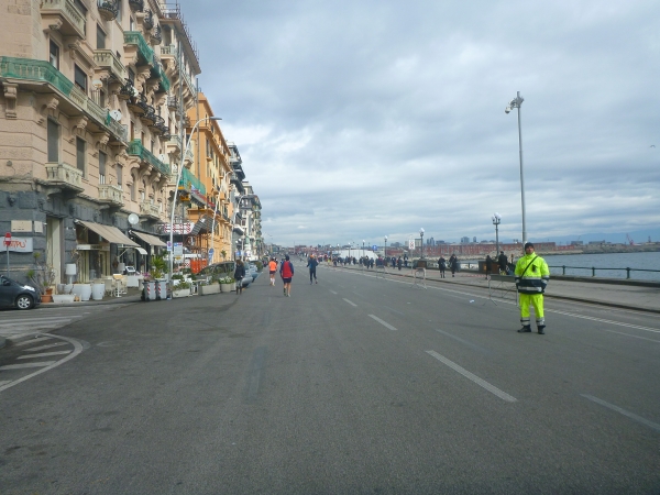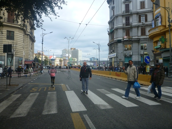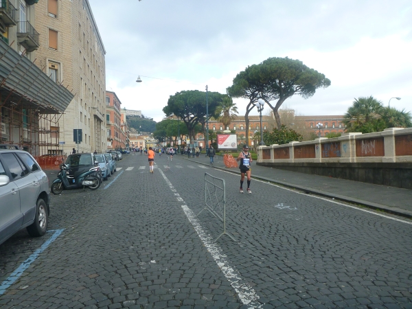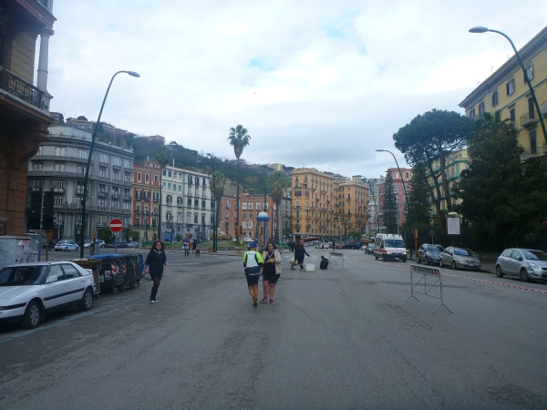Mann, ist das schräg. Aber irgendwie müssen ja die 42.195 Km gelaufen werden. Und in einem Moloch von Stadt wie Neapel den Verkehr wegen eines Marathons zu sperren, ist nicht so einfach. So halten sich die Sperrungen in Grenzen.