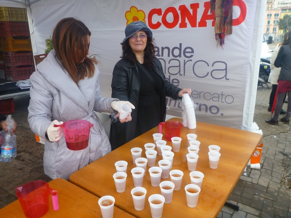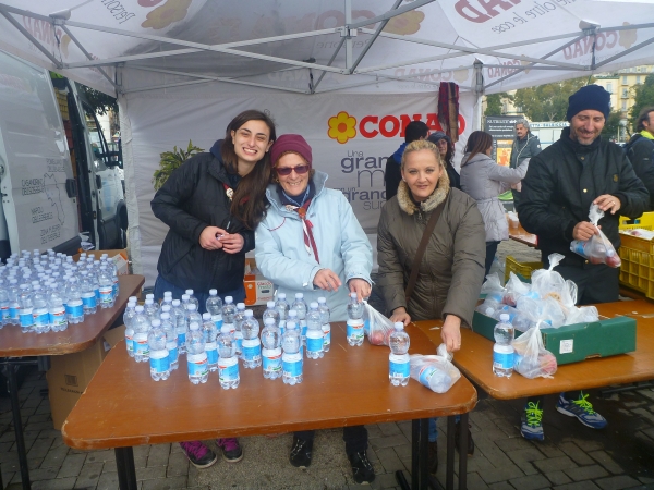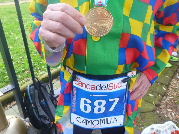 Und nun darf ich endlich durch den Zielbogen laufen. Arrivo! Hinter der Ziellinie erhalte ich die verdiente Medaille mit dem Vesuv als schönem Motiv und einen Verpflegungsbeutel.