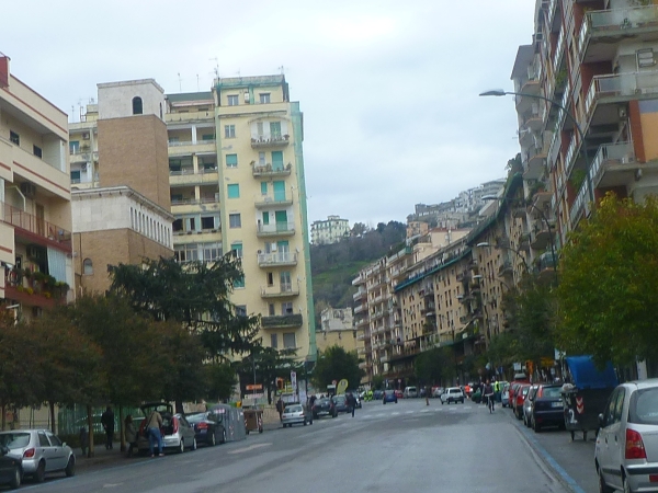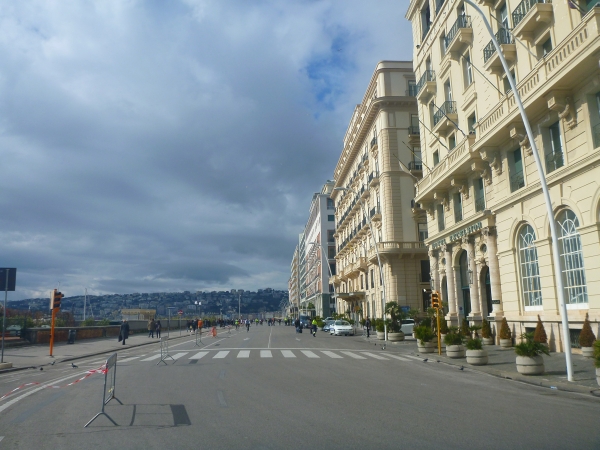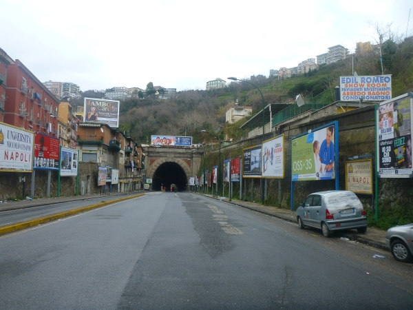 Durch Häuserschluchten nähern wir uns dem Tunnel "Galeria di Posillipo". Gut einen Km geht es durch den Tunnel. Auf der anderen Seite sind wir im eigentlichen Neapel. Es geht um einen Kreisverkehr zum nahe gelegenen Meer. Auch hier kommen uns Läufer entgegen. Der Kreis ist ein weiterer Wendepunkt der Marathonstrecke. Aber erst einmal müssen wir noch ins Herz der Stadt.