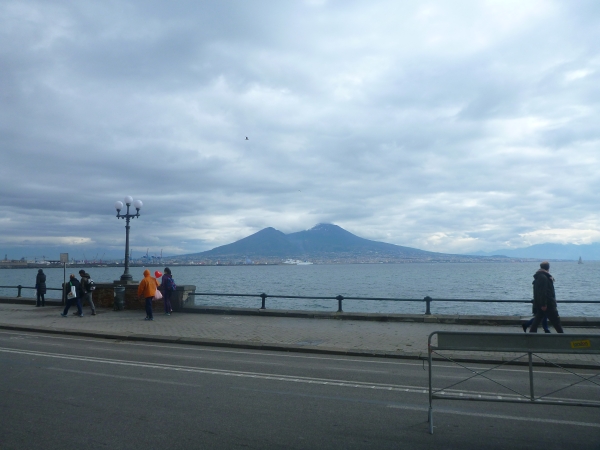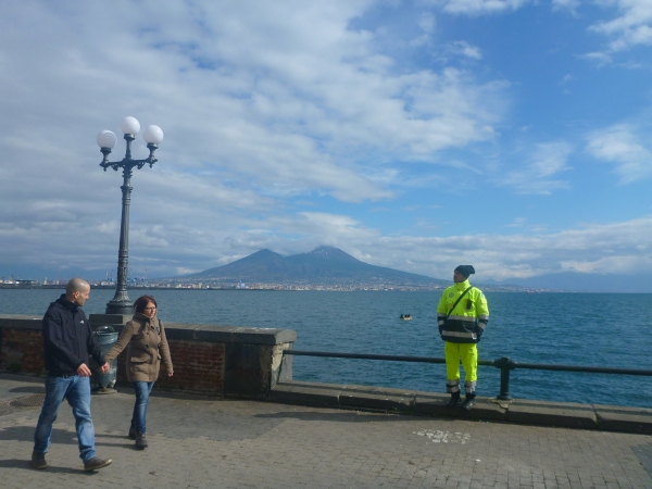Zur Piazza Plebiscito ist es für mich heute schon eine kleine Quälerei. Ich bin noch nicht fit und mache nach dem Königspalast auf der Via Console angesichts des Panoramas mit Meer und Vesuv in der Sonne eine etwas längere Fotogehpause. Ich gebe es zu, ich habe eine leichte Motivationsdelle. Aber das Panorama liefert ein perfektes Alibi.