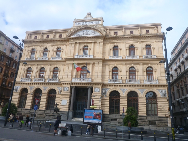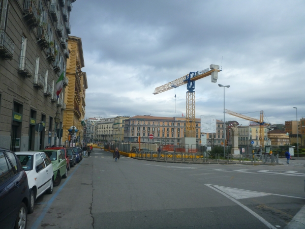 Nach Verlassen der Piazza Plebiscito kommen wir an der markanten Galeria Umberto I vorbei. Hat schon was, dieser Einkaufstempel. Auch die Galeria ist wegen Bauarbeiten eingerüstet. Es geht hinab, rechts liegt das imposante Castel Nuovo.