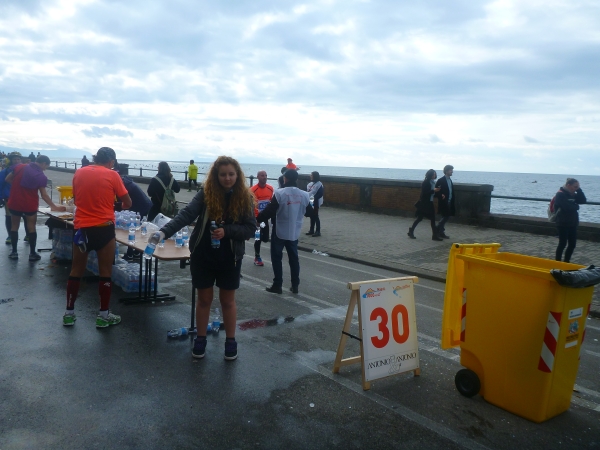 Wir nähern uns dem Ziel - um rechts daran vorbei zu laufen. Zur Rechten liegt das kleine Castel dell'Ovo vor uns, links der Via Partenope liegt Pizzofalcone. Bei Km 30 ist wieder eine VS. Inlineskater tummeln sich auf der abgesperrten Straße.