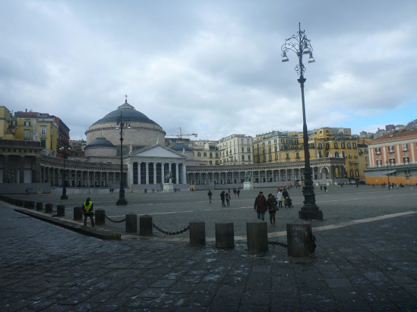Die der beeindruckenden Piazza Plebiscito zugewandte Seite des Königspalastes ist komplett eingehüllt. Nicht Christo ist hier am Werk, sondern einfache Bauarbeiter. Noch ein guter Zehner liegt vor uns.
