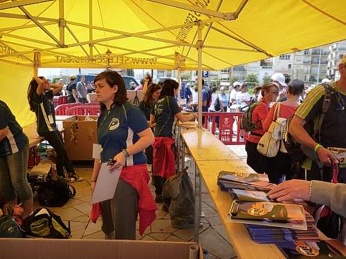 Die Startnummer ist aus Seide, löst sich also weder in der Brandung noch unter der Dusche auf. Gepäckabgabe, es wird zum Etappenziel gebracht.