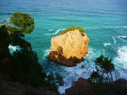 Die Küste ist nun unverbaut. Der GR 92 berührt immer wieder kurz die Küstenlinie, um dann unmittelbar durchs Wasser zu führen. Manchmal steigt er hoch hinauf in die Kiefernwälder am Cap Roig, wir kommen ohne Eintritt in den Botanischen Garten La Fonradada im Espai d´Interès Natural Castell-Cap Roig. Weit verstreute Villen verstecken sich im Wald am Küstensaum. Ein Softdrink-Automat wehrt sich gegen mich, der Dreckskerl.