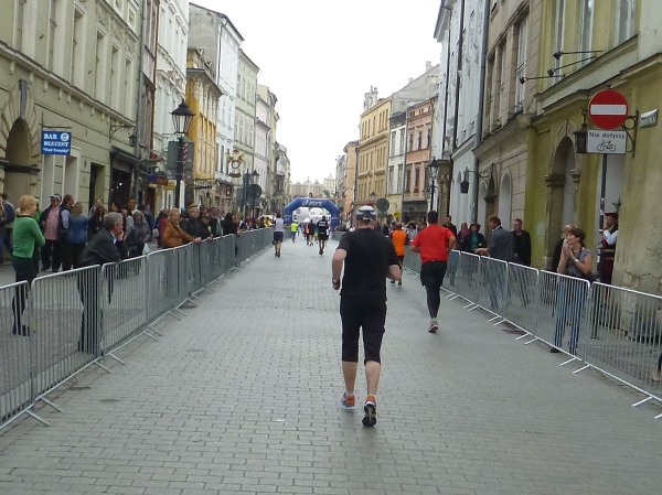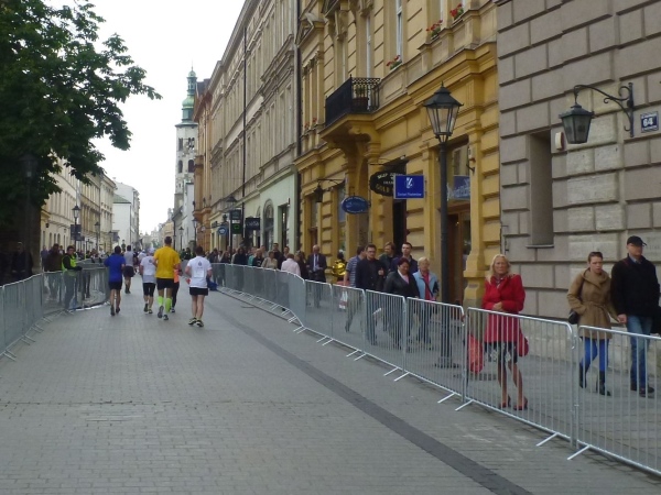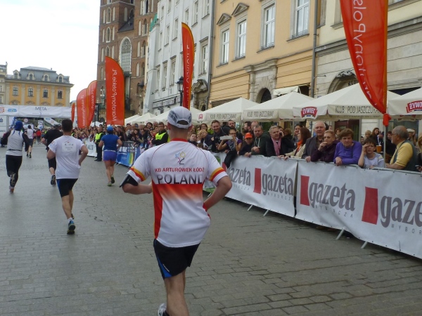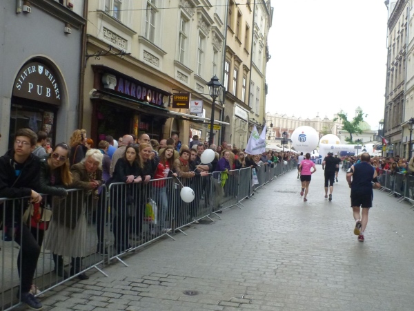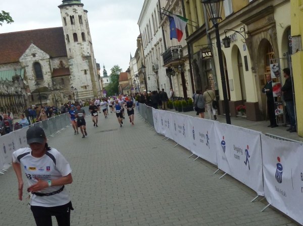 Bei Kilometer 40 nach der Weichselbrücke schwenken wir an einer mit Zuschauern dicht besetzten Stelle unter lauten Disko-Klängen auf die Zielgerade ein. An der Uferpromenade geht es direkt Richtung Wawel. spürbar bergauf. Der Rynek liegt 20-30 Meter höher. Links das Gebäude des erzbischöflichen Priesterseminars. Kilometer 41 kommt irgendwie zu früh, was ja nicht schlecht ist. Rechts die romanische St.-Andreas-Kirche, daneben St. Peter und Paul. Der Laufweg ist gesäumt von Zuschauern. Viele davon feuern uns an oder genießen in den unzähligen Cafés den schönen Sonntagvormittag. Km 42, vor uns der Rynek. Die letzten 100 Meter auf dem Marktplatz Richtung Marienkirche. Zum x-ten Male überholt mich ein Läufer in gelb-weißer Hawaiihose und Baumwollhemdchen, mit dem ich mir über viele Kilometer ein Katz- und Mausrennen geliefert habe.