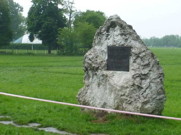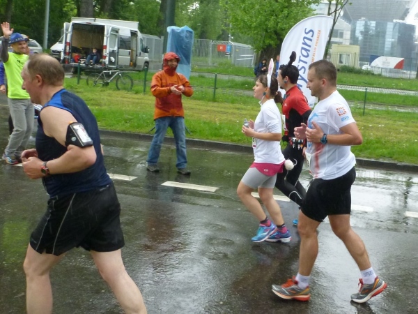 Als herausragendes Erlebnis der zweiten Runde entpuppt sich ein plötzlicher Regenschauer. Die entsprechenden Pfützen im zusammengestückelten Straßenbelag veranlassen einige Wasserscheue zu tollkühnen Sprüngen. An einer Stelle werden wir professionell angefeuert. Der Sprecher ruft immer etwas von Monte Cassino in sein Mikrophon. Heute ist der 70. Jahrestag dieser Schlacht in Italien, an der sehr viele Polen heldenhaft teilnahmen. Vielleicht will er da Vergleiche zu unserem heldenhaften Lauf anstellen? Im nahen Park wird anscheinend eine Skulptur des polnischen Bären Woitek aufgestellt, der in Monte Cassino wichtige Kriegsdienste leistete (nähere Info im Danzig-Bericht).