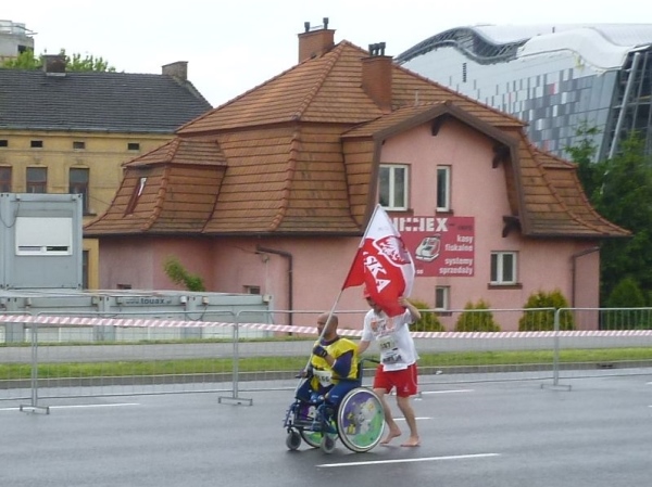 Ein Barfußläufer, der oft mit seiner polnischen Fahne bei Marathons unterwegs und auch auf M4Y hin und wieder zu sehen ist, hat diesmal einen Begleiter im Rollstuhl dabei.