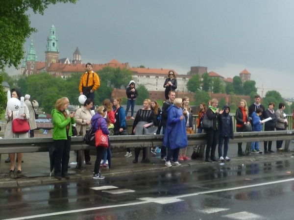 Wir Läufer belegen jetzt erst mal ganz schnöde eine breite Stadtautobahn. Einer Unterführung mit ohrenbetäubendem Gejohle folgt erneut eine der vielen Begegnungsstellen. Kurze Zeit später dann wieder eine nette Gegend. Wir sind in der Altstadt von Podgórze. Ein bisschen wellig ist die Laufstrecke hier. Eine blaue Stahlbrücke mit Straßenbahngleisen kommt mir bekannt vor: Gibt es so was nicht auch in Dresden? Leider sieht man unterwegs (fast) keine Trambahnen, nur viele Gleise, da auch Krakau über ein sehr großes Netz verfügt. Die Strecke ist komplett vom öffentlichen und Individualverkehr abgetrennt. Hupende Autos hört man nicht, aber auf einmal Halleluja-Gesänge. Dehydriert? Ein rot gewandeter Damenchor singt schmissig kirchliche Lieder.