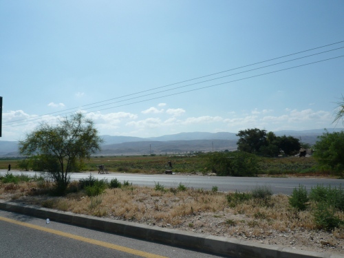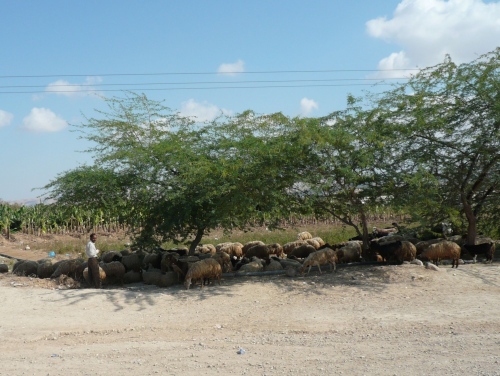 Bei km 20 halte ich an und lasse mich mit einem Streckenposten fotografieren. Eigentlich will ich ja ein Foto mit dem schicken uniformierten Polizisten, aber die darf man nicht fotografieren. Dann geht es weiter zum Halbmarathontor das wir durchlaufen. Die Temperaturen sind schon auf 25 Grad geklettert. Ich überhole einige Läufer, die an der ersten leichten Welle gehen müssen. Die Landschaft ist hier herrlich und es gibt immer wieder vereinzelt Menschen am Straßenrand, die uns zujubeln. Viele rufen auch „Wellcome in Jordan“. Jetzt kommen die langen Geraden, die am Horizont verschwinden. Die Sonne beginnt zu brennen. Rechts der Straße ein Schafhirte, der sich im Schatten der wenigen Bäume vor der Sonne schützt.