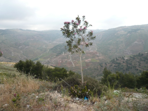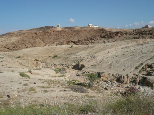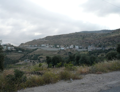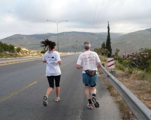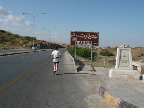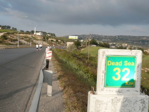 Wir kommen durch einen kleinen Ort mit einer Moschee und es geht weiterhin steil bergab die nächsten Kilometer. Bei Km 18 überholt mich der erste Ultraläufer, begleitet von einem Krankenwagen. Kurz danach kommt ein Hinweisschild: Dead Sea 18km. Auf den ersten 18km sind wir schon 800 Höhenmeter runter gelaufen. Jetzt kommt die Sonne durch und es wird warm. Die Temperaturen steigen schnell an und ich ziehe mein Unterhemd aus, denn ab jetzt reicht das dünne Laufshirt.