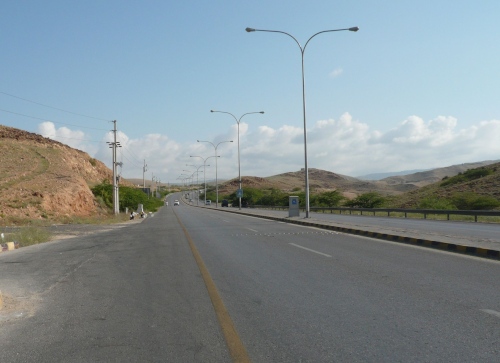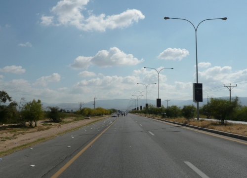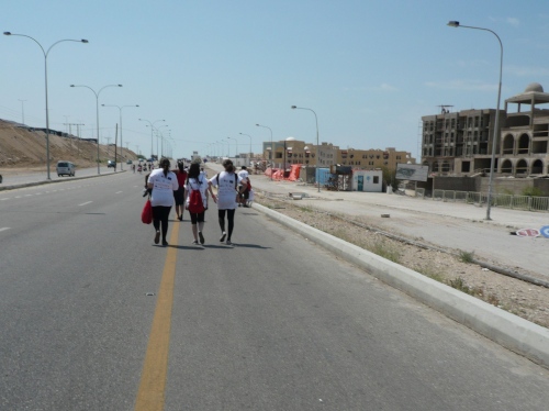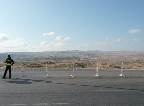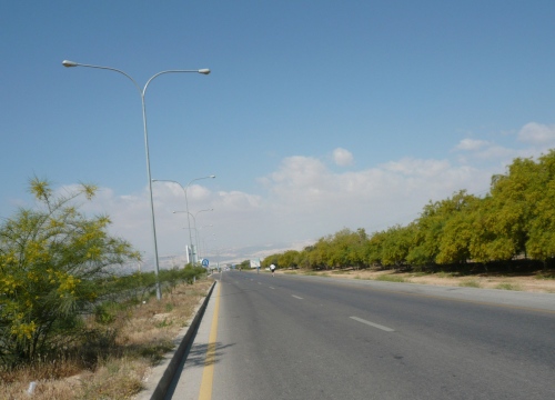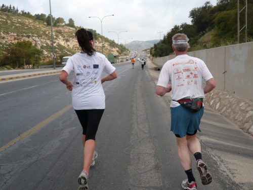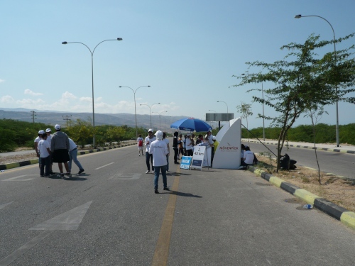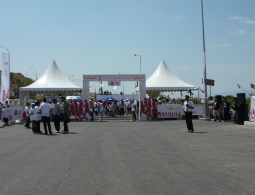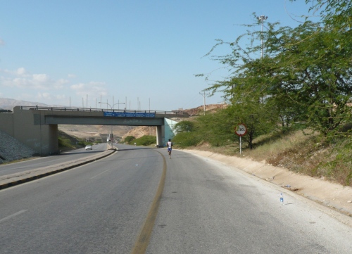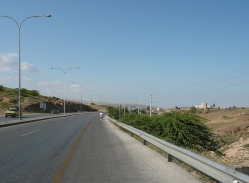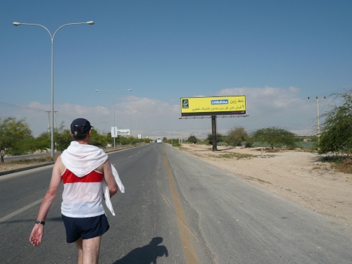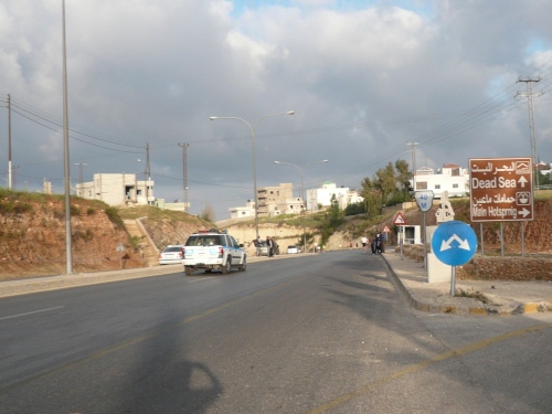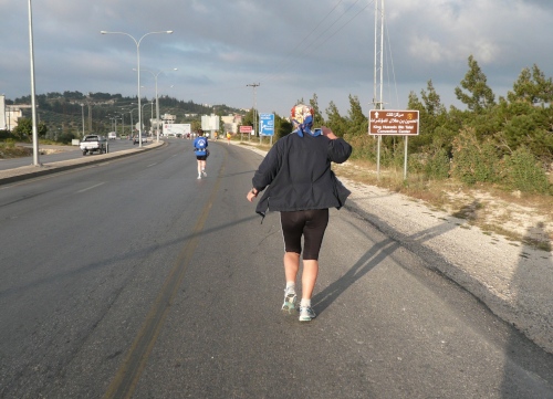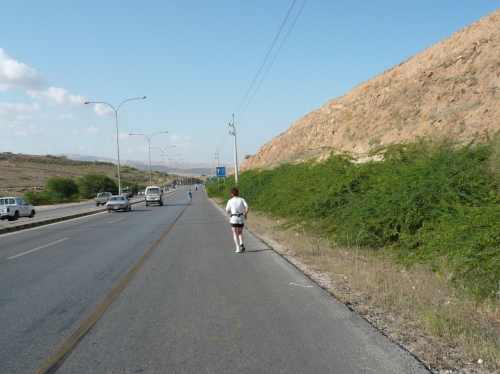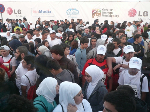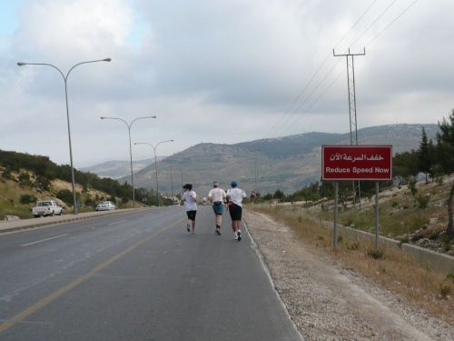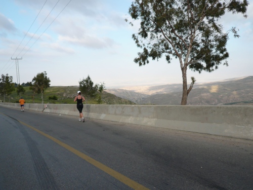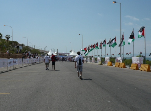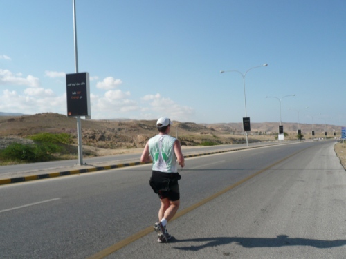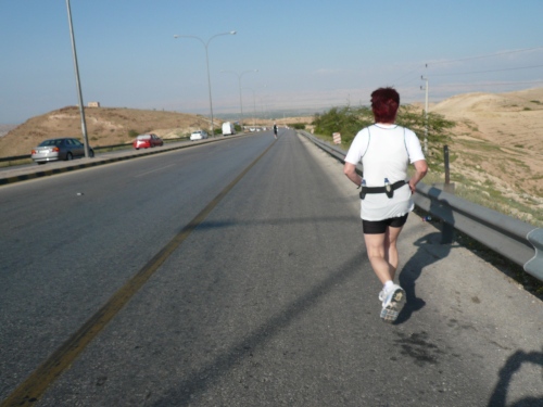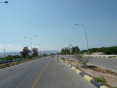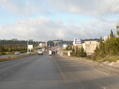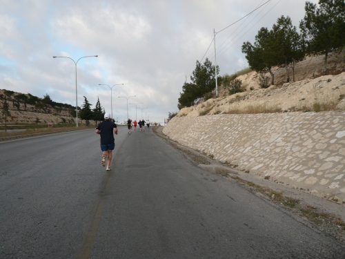 Um 6:50 Uhr sind wir am Marathontor. Die abgesperrte Straße ging sofort bergab, denn wir starten auf ca. 800 Meter über NN. Im Ziel sind es 400m unter NN. Die breite, vierspurige Straße ist zur Hälfte für uns gesperrt. An allen Ein- und Ausfahrten stehen Polizisten und Militär und lassen keinen auf die Laufstrecke. Auf den ersten Kilometern gibt es zwei kleine Wellen und dann einen herrlichen Blick immer bergab. Durch die geringe Teilnehmerzahl hat sich das Feld sehr schnell auseinander gezogen und man läuft relativ allein. Es geht vorbei am King Hussein Bin Talal Convention Center. Links und rechts der Straße liegen einige wenige Häuser und Läden.