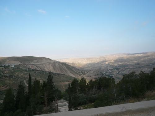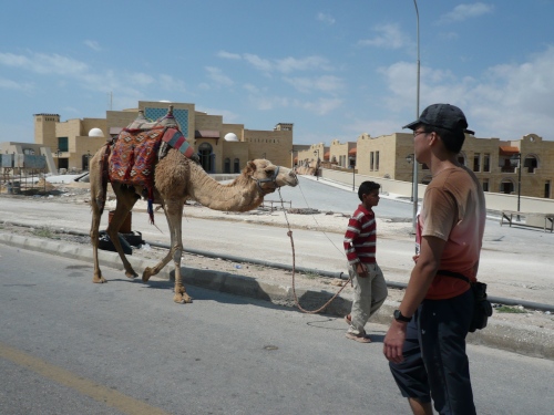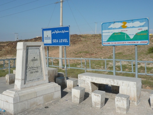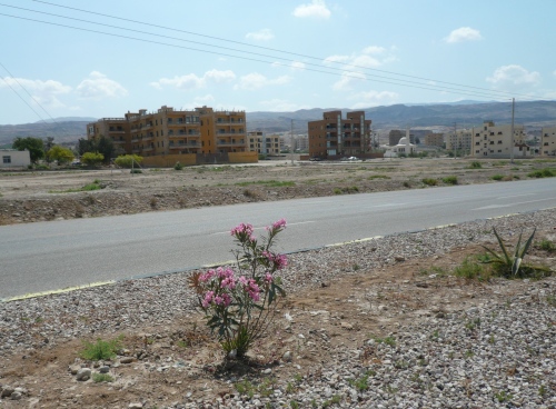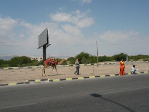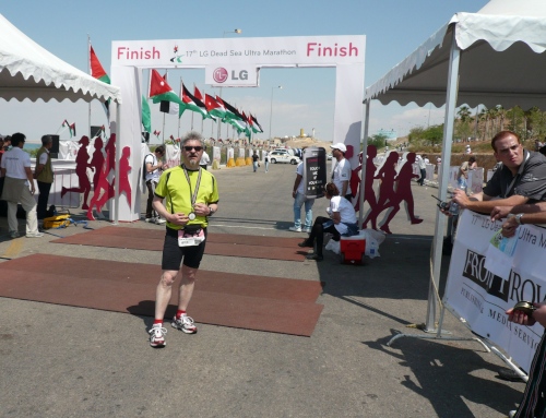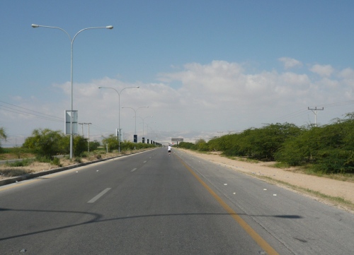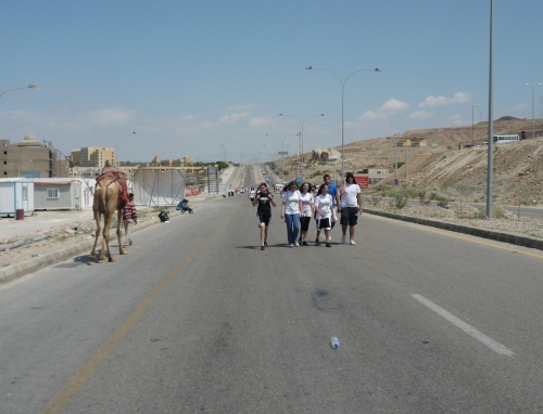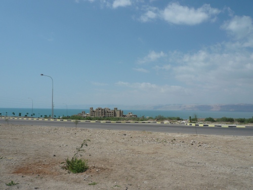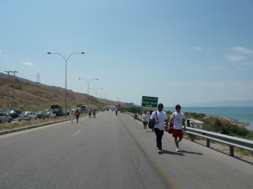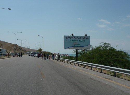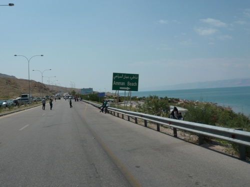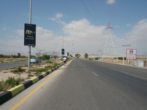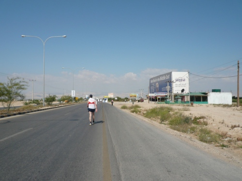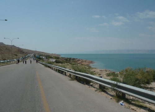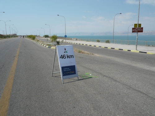 Am km Schild 42 habe ich 34 Kilometer schon hinter mir und die Halbmarathonis 13 km. Rechts der Straße führt einer ganz gemütlich sein Dromedar aus. Hier in Jordanien leben nur Dromedare, die „Kamele“ mit einem Höcker. Links der Straße entsteht eine neue Siedlung und kurz danach hat man zum ersten Mal einen Blick auf das Tote Meer. Die ewig lange Gerade macht meinen Knick und es geht auf die nächste lange Gerade am Meer entlang.