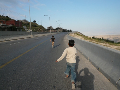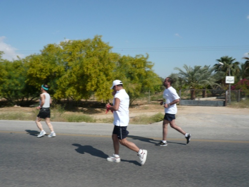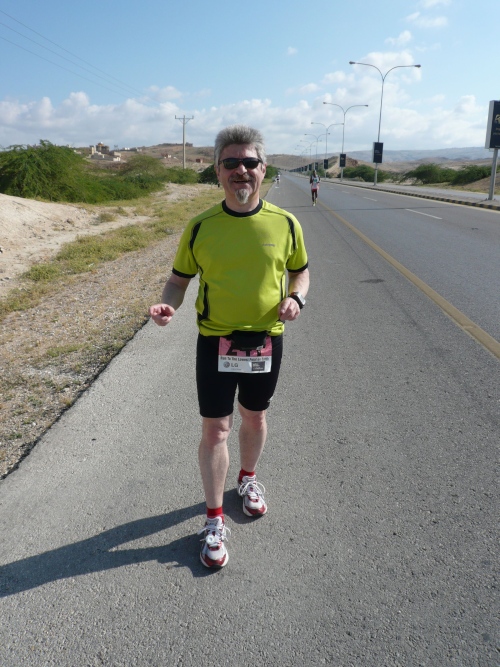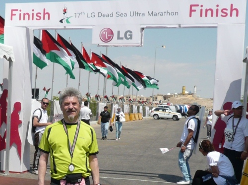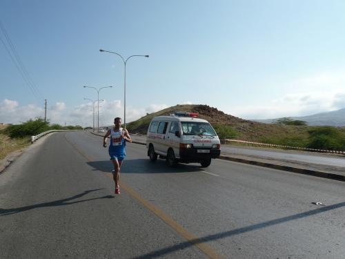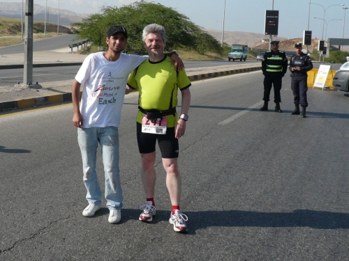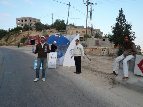 Alle 3km gibt es Wasserstationen. Den Läufern werden 0,5l Flaschen gereicht. Nach rechts gibt es einen freien Blick in die gegenüberliegenden Berge. Manchmal sieht man ein paar Beduinenzelte oder Menschen mit ihren Ziegenherden am kahlen Berg. Kurz vor Km 10 (Ultraschild 18km) kommt ein kleiner Araberjunge in Schlappen zu mir. Er gibt Gas und rennt voller Freude vor mir her Seine großen braunen Augen strahlen. Ein weiterer Junge, vermutlich sein Bruder, schließt sich uns an und beide rennen nun mit mir um die Wette. Nach ca. 200 Metern sind sie platt aber stolz, schneller gewesen zu sein als ich.